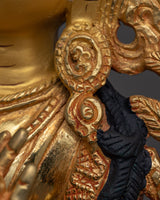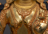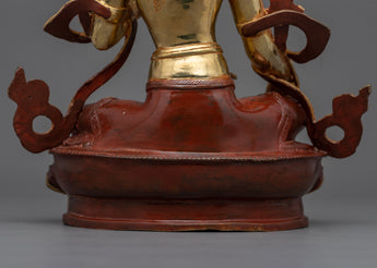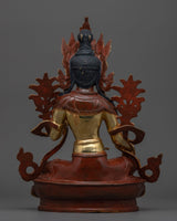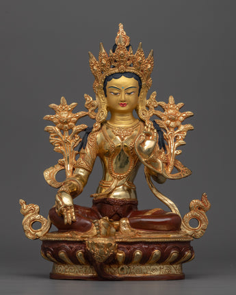 This statue, which is made of 24K Gold Gilded, oxidized copper, and acrylic paints exudes compassion and ageless knowledge. The lotus flowers she is holding the Lotus Flower that symbolizes purity, and her right hand in the Varada Mudra signifies her readiness to fulfill her devotees requests. When someone seeks refuge in her, her left hand forms the Vitarka Mudra, providing safety and courage.