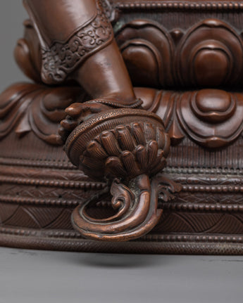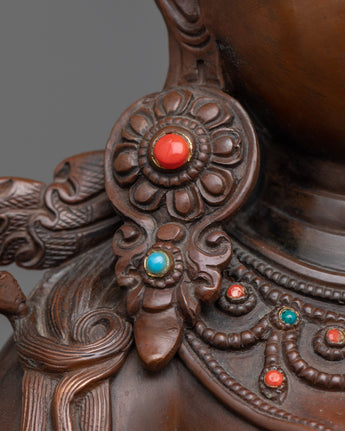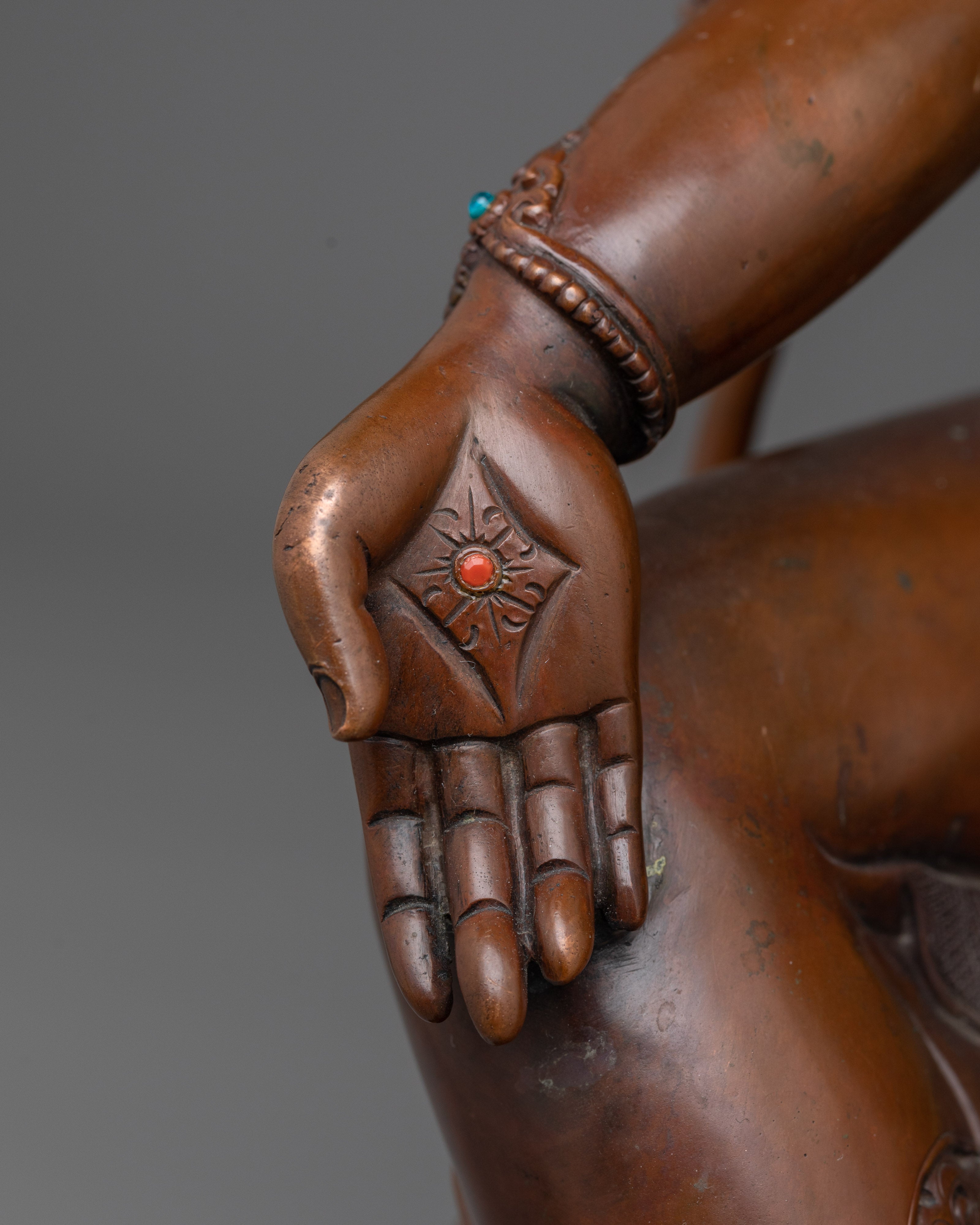 This Green Tara Oxidized Figure Statue can help you embrace protective compassion. This monument radiates peace and heavenly protection, standing 18.1 inches tall with an 11.8 inch base. With its timeless elegance and spiritual grace, it is crafted from sturdy oxidized copper. Green Tara comforts and protects those who seek her guidance by invoking sentiments of compassion and peace.