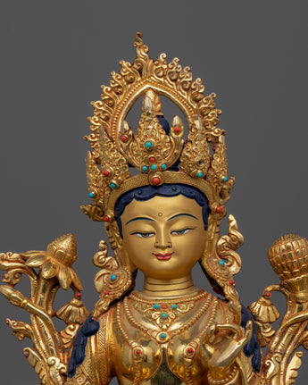 Traditionally Carved Green Tara Pure Land Statue | 24K Gold Gilded Tibetan Sculpture