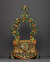 Green Tara is shown in her typical sitting position on a throne flawlessly carved by the artists, in which we can see various designs with symbolic meaning, with one leg extended, suggesting her readiness to answer devotees' requests. In the mudras of awarding boons and protection, her hands invoke serenity, compassion, and the prompt removal of impediments. Put on a meditation altar, in a personal shrine, or as a centerpiece in your house, this Green Tara sculpture gives tranquility and heavenly protection.