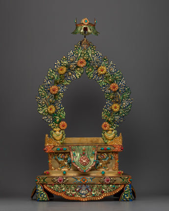 The heavenly presence of the Green Tara Seated in a Throne, a majestic statue standing 28.3"/72 cm tall with a base width of 16.1"/41 cm and weighing 8.24 kg. Crafted with a copper body, this statue is elaborately embellished with 24K gold gilding, gold and acrylic paintings, and hand-carved gemstone inlays, demonstrating Tibetan artists' artistic mastery. The exquisite throne emphasizes her role as a respected savior and guardian.