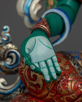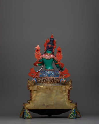 Green Tara is one of Tibetan Buddhism's most beloved goddesses, known for her sympathetic demeanor and swift responsiveness to people who call on her. She is known as the "Mother of Liberation," as she helps followers overcome fear, suffering, and hardship. Her seated position on a throne symbolizes her role as a savior and protector, ready to guide practitioners to enlightenment.