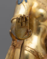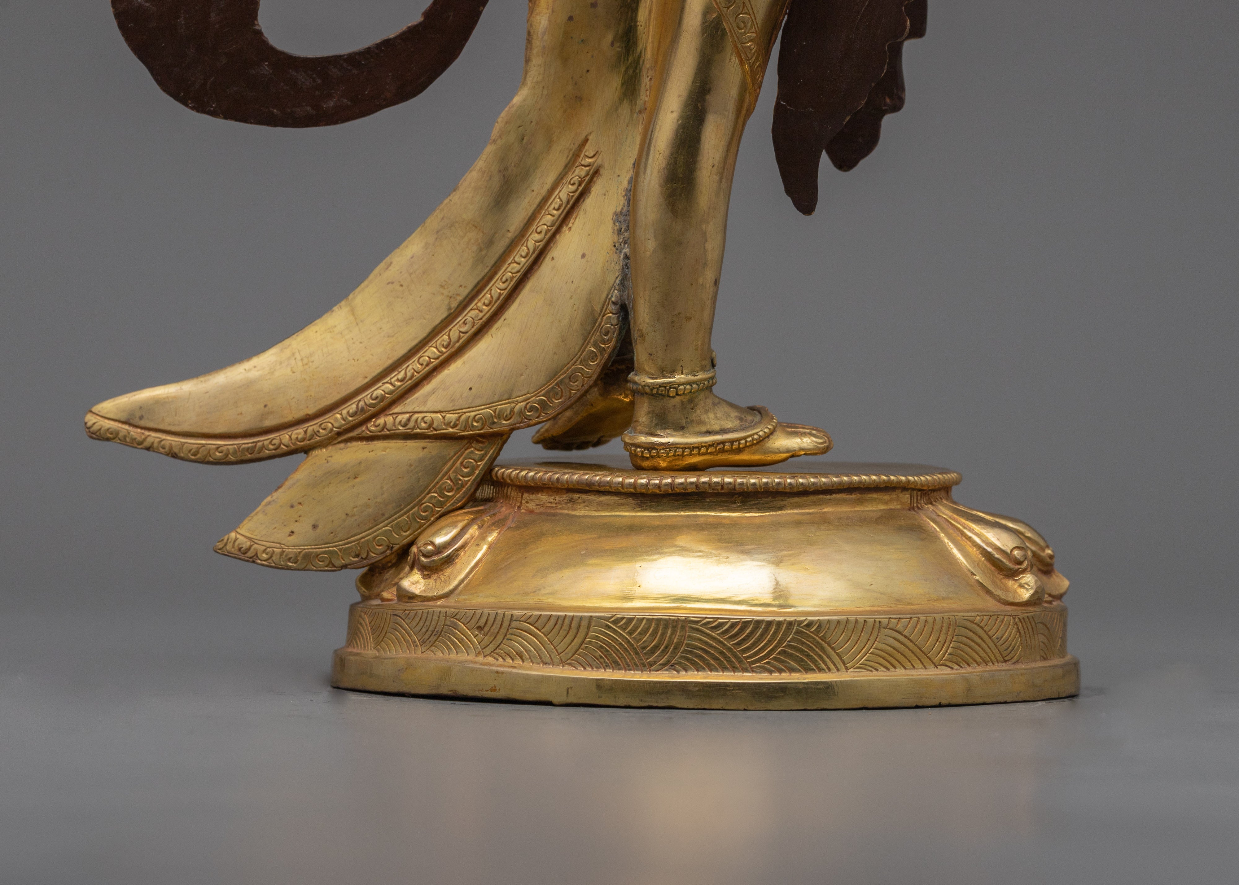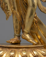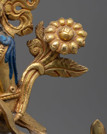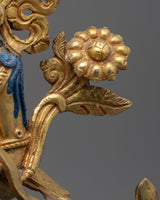 Our Green Tara Standing Figurine invites you to enter the world of Protectiveness and compassion. This statue, which is crafted with great attention to detail, captures the heavenly essence of Green Tara, the symbol of knowledge and compassion. This sculpture, which stands 15 inches tall and weighs 3.40 kg, exudes grace and tranquility. It is a main point in any room thanks to its excellent acrylic paints and 24K gold plating, which give it an air of refinement and beauty. The ageless compassion and wisdom of Arya Tara are reflected in every curve and feature of this statue. Her healing energy is inviting you to connect with every aspect, from her flowing robes to her compassionate expression on her face.