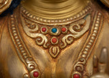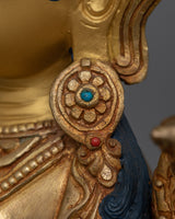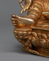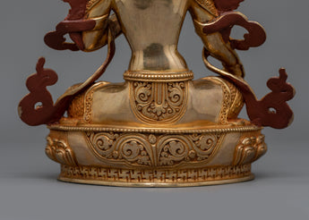 This Green Tara also recognized as the Venerable Mother of Liberation statue, standing 9.8 inches tall with a base of 7.3 inches, is a stunning symbol of compassion and protection. The statue, which weighs 2.33 kg, has a copper body that is elaborately painted in gold and acrylic and is gilded in 24K gold. The artistry emphasizes the beauty of Green Tara, the venerated Buddhist deity the Mother of Liberation.