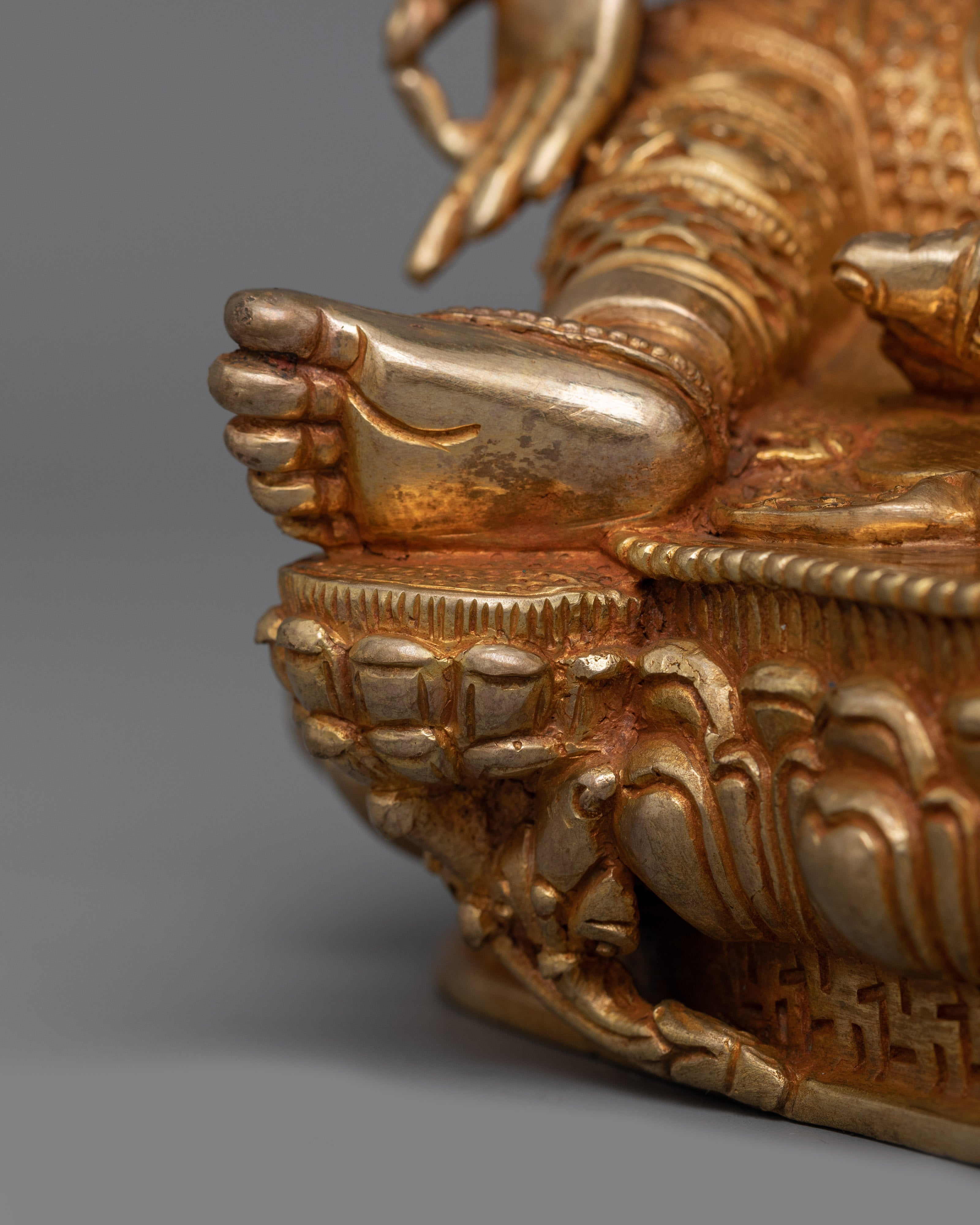 Her calm demeanor reflects infinite compassion, signifying her dedication to assisting all living things. Green Tara is seen with her right hand extended outward in the Varada Mudra, also known as the Gesture of Compassion, with her fingers pointing downward and her palm facing front. This holy act symbolizes her constant kindness and her promise to help dispel worries and barriers while providing comfort and direction to everyone who asks for her favors. This monument, which embodies Green Tara's protecting and caring qualities, is a deep addition to any setting.