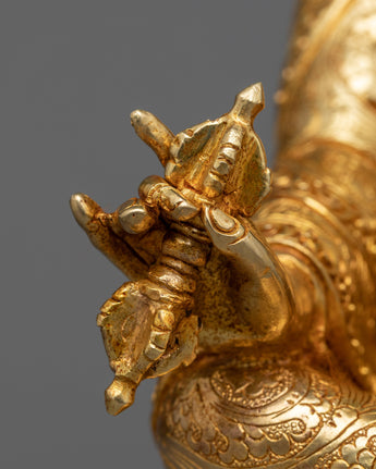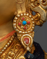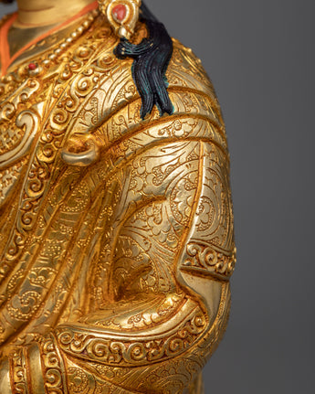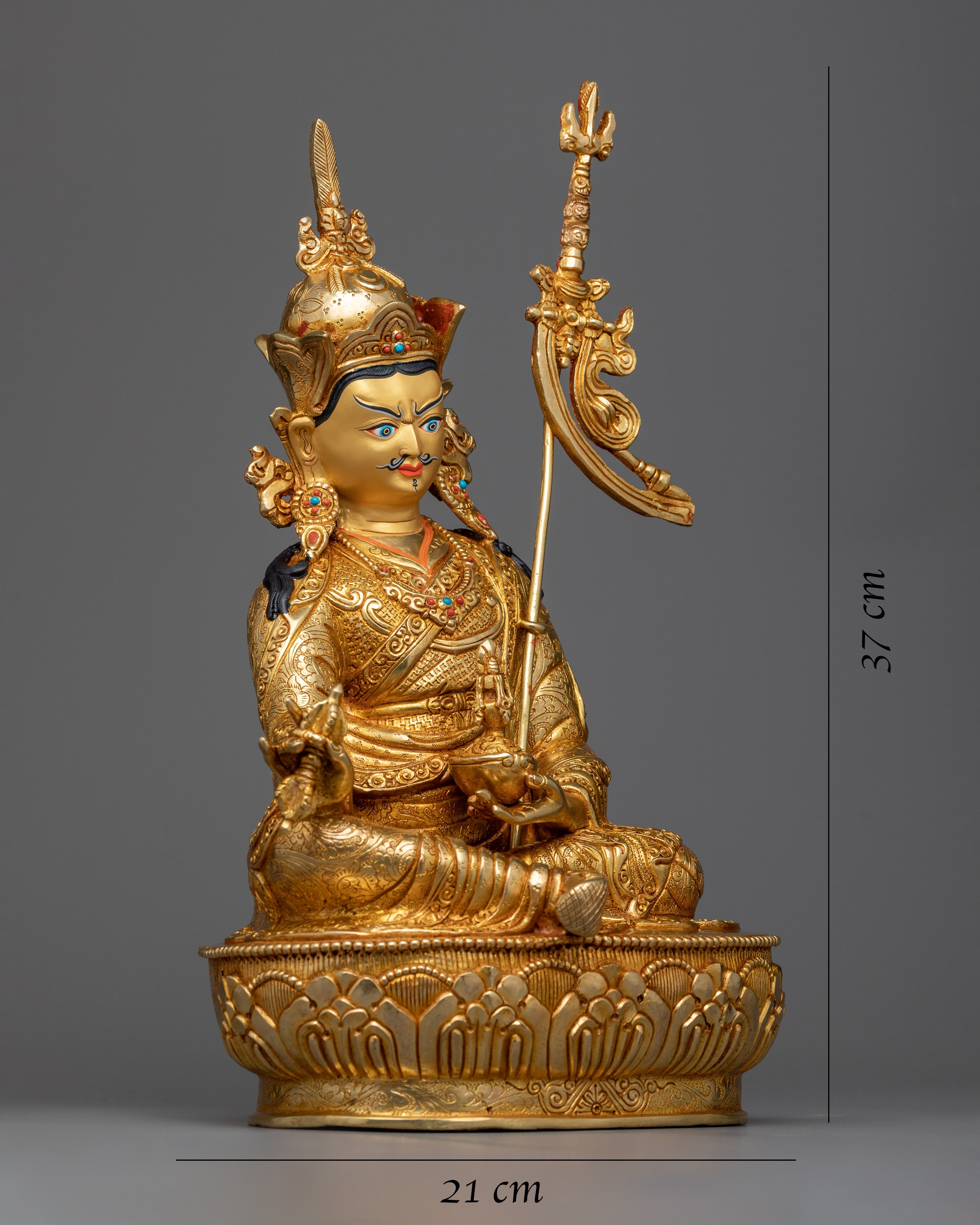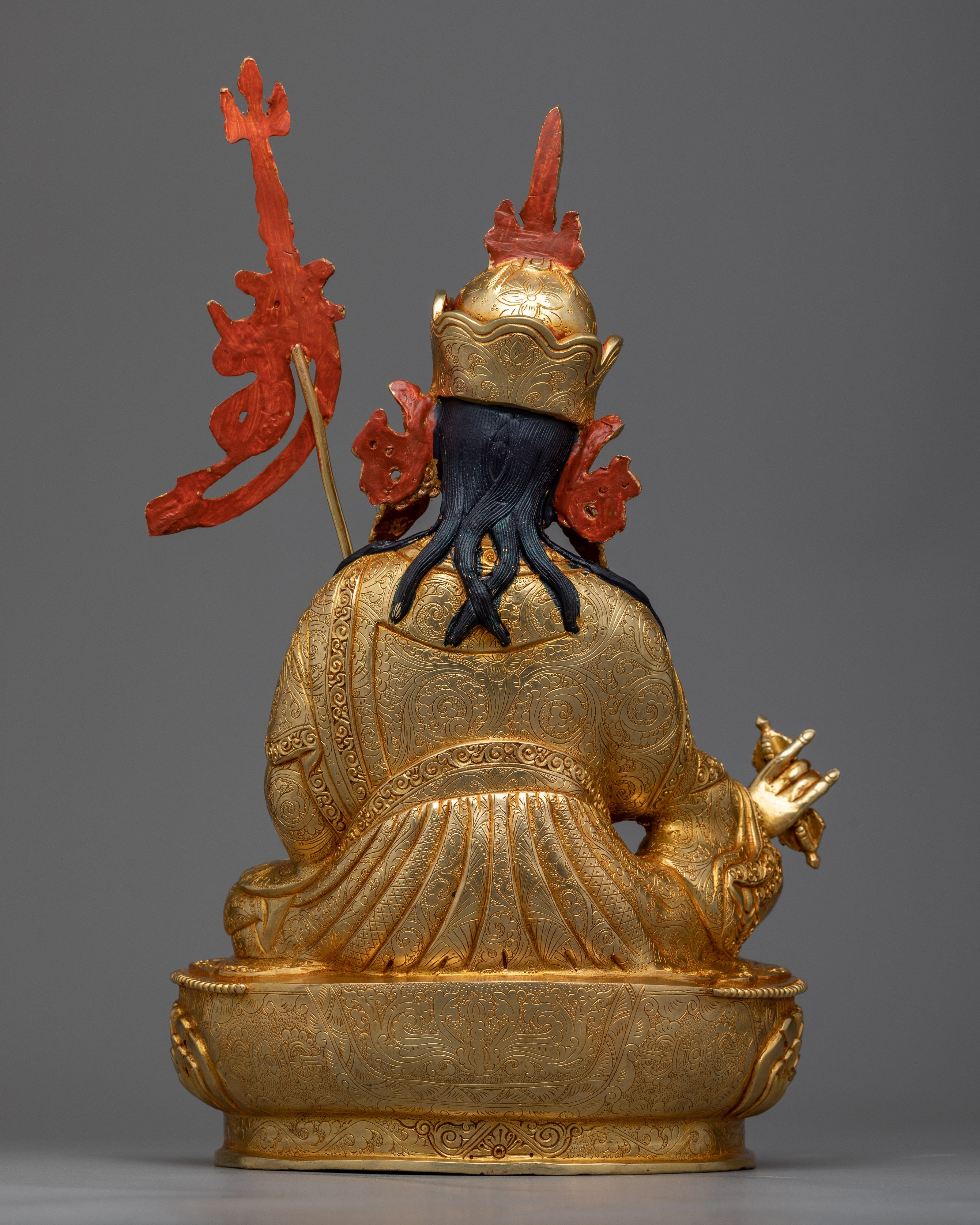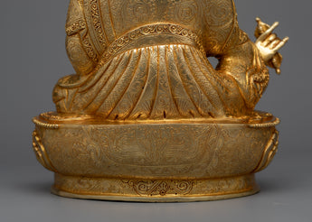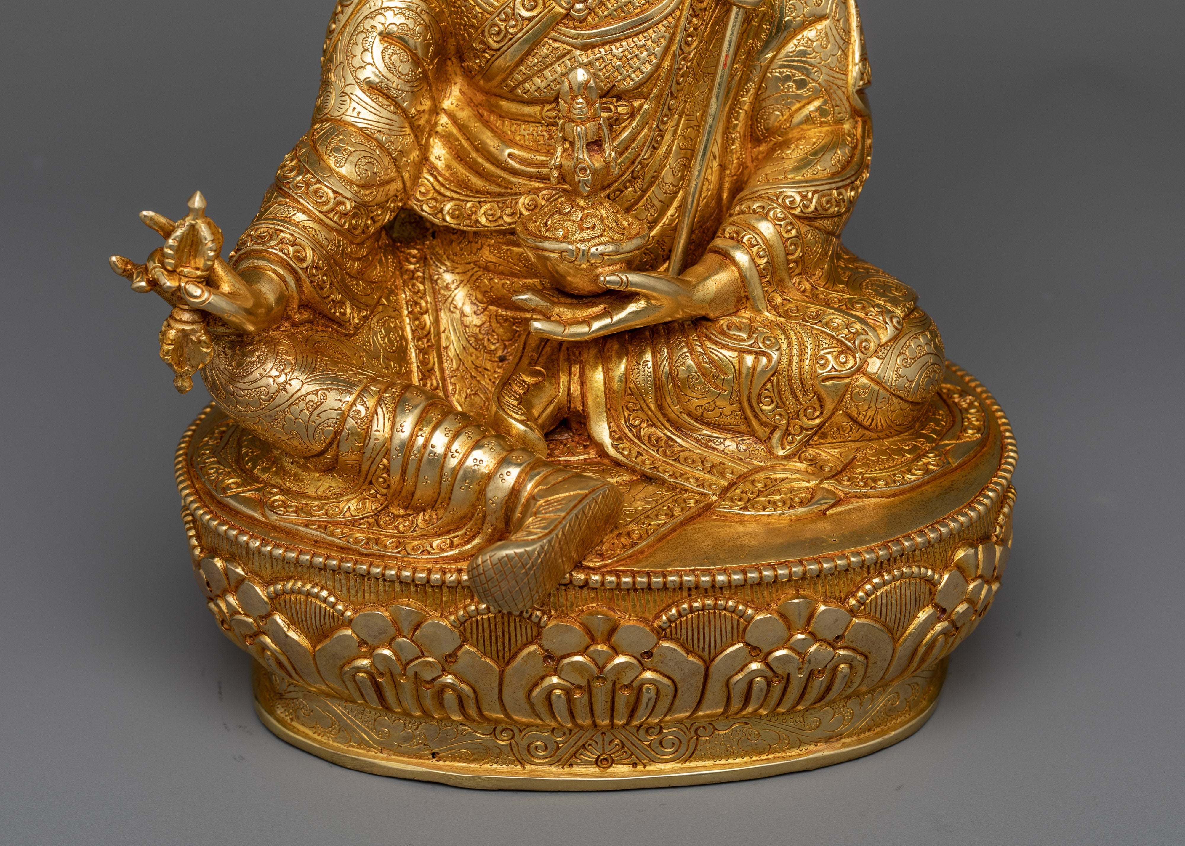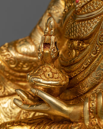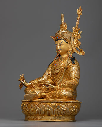 The Guru statue is a work of art, handcrafted in traditional Himalayan art of Nepal by expert craftsmen on a copper alloy with 24k gold gilding. He is pictured sitting atop a lotus moon disc, holding the vajra scepter in his right hand and a skullcup filled with nectar, jewels, and a long-life vase in his left hand. The elaborate katvanga staff is held up on the left shoulder.