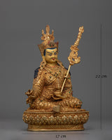 The Guru Rinpoche 22cm Small Handmade Statue is 22 cm tall, lovingly crafted from finest copper, and gilded in 24K gold. The calm yet imposing presence of Guru Rinpoche is aptly depicted in this statue. The statue's elaborate details are highlighted by the gold finish, which makes it a stunning addition to any setting, whether it be spiritual or interior design.