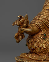 The statue has a lifelike and dynamic quality due to the skillfully carved precise carvings on its attire. Every element of the statue, from the profound look on Guru Rinpoche's face to the elaborate patterns of his apparel, is skillfully and carefully made thanks to the artists' precise attention to detail. The statue's timeless and venerated aspect is enhanced by the gold finish, which also heightens its spiritual and aesthetic appeal.