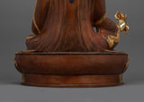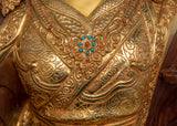 The Guru Rinpoche Oxidized Copper Sculpture is a depiction of the founder of Tibetan Buddhism, Padmasambhava. This statue, which stands 21.9" (55.5 cm) tall and 14.2" (36 cm) at the base is made by hand from oxidized copper, gold, and acrylic paintings and 24K gold gilding.