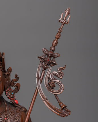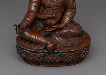 Accept the deep spiritual lessons that our Guru Rinpoche Oxidized Statue embodies. With a height of 15.2 inches and a base measuring 9.1 inches, this finely sculpted statue perfectly embodies the essence of Guru Rinpoche's holy presence. With its stunning carvings and construction from oxidized copper, this piece invites you to delve deeper into your spiritual practice and set off on a life-changing voyage of self-discovery. Feel the calm face of Guru Rinpoche, whether it's in your living room or in your meditation area, as it opens your eyes to the boundless possibilities of your own spiritual journey.