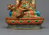Indulge in the stunning craftsmanship of the Guru Rinpoche Tantric Deity Statue, a skillfully created emblem of spiritual enlightenment. This statue, which is 19.3 inches tall and has a base of 15.7 inches, is made of copper and is gilded with 24K gold. It exudes a sense of holiness and veneration. Each element, which is handcrafted using age-old methods, demonstrates the craftsmen' commitment to upholding historical customs. The statue's heavenly presence and spiritual importance are enhanced by the addition of depth and color through the use of acrylic and gold paints.