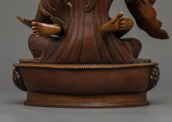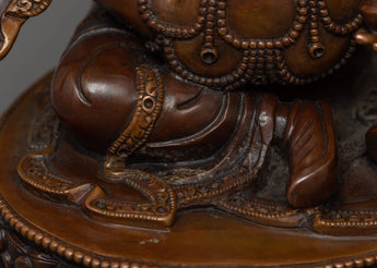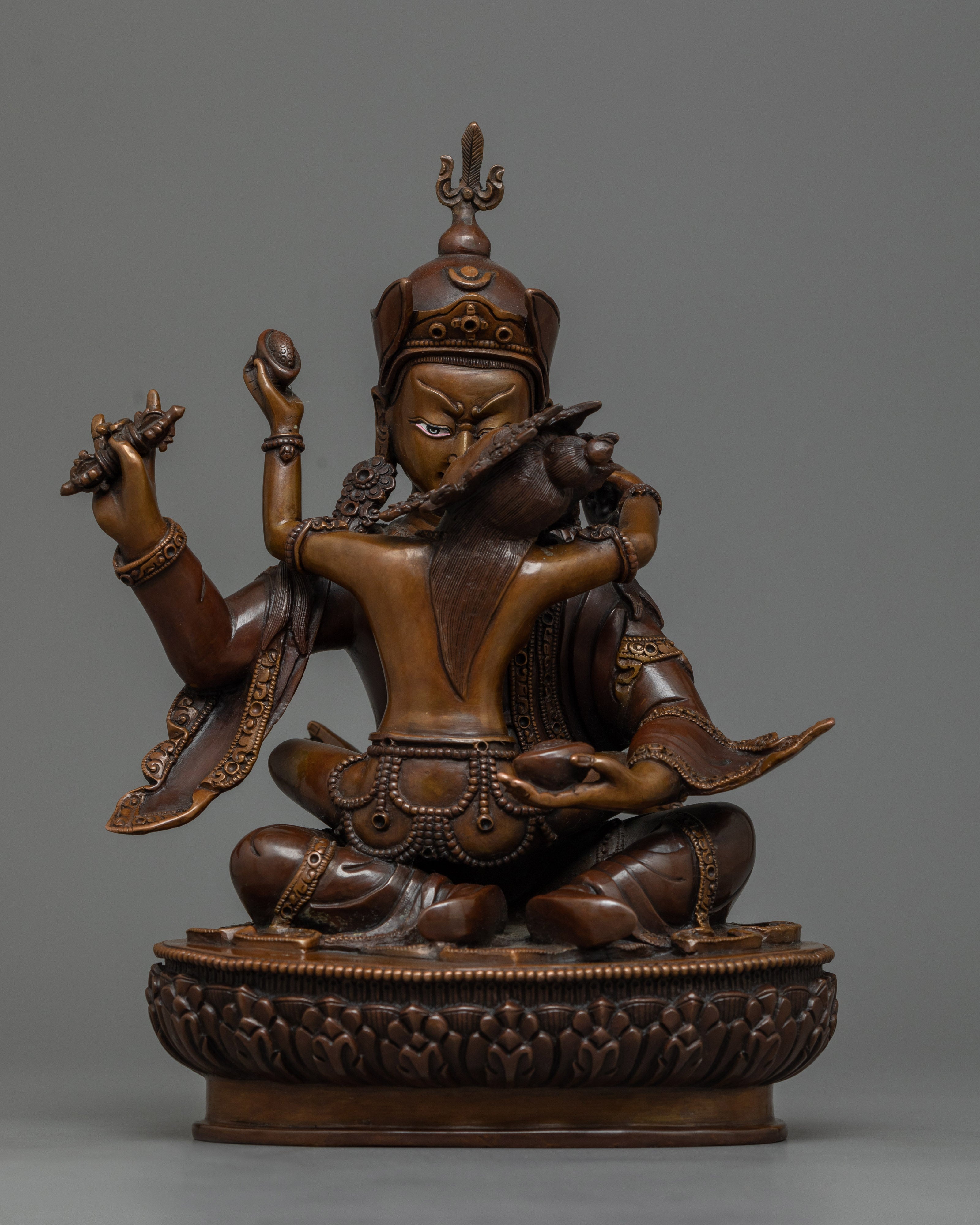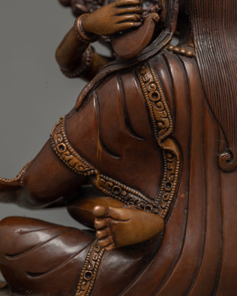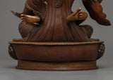 This traditionally hand-crafted Guru Rinpoche with Consort statue is made from oxidized copper in Nepal by Nepali artists. With intricate details and high quality, this statue exudes a sense of spiritual reverence and cultural authenticity. Display it in your home or place of worship for a tangible connection to Buddhist traditions.