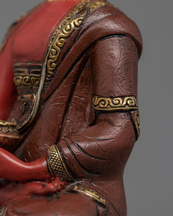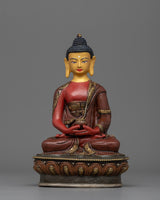 Amitabha is shown in a tranquil sitting stance, holding a begging bowl in his lap to symbolize renunciation and the simplicity of the enlightened life. His peaceful countenance represents the knowledge and compassion he bestows on individuals seeking rebirth in his Pure Land, Sukhavati. This statue, with its gold highlights and oxidized copper details, is a profound spiritual item suitable for devotional practice, meditation, or contemplation of Amitabha's teachings on unlimited light and boundless compassion.
