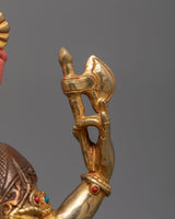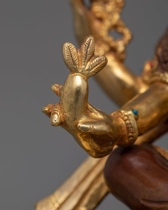 God Sri Ganesh Statue is 9.1 inches tall, crafted of oxidized copper, and embellished with 24K gold gilding, gold, and acrylic paints. This crafted statue, which stands on a 7.1-inch base and weighs 2.24 kg, reflects the wisdom, wealth, and protective force of Sri Ganesh, the remover of barriers and the deity of fresh beginnings. The mix of oxidized copper and bright gold detailing enhances Ganesh's holy presence, making it an effective spiritual tool for your personal altar, meditation room, or home decor.