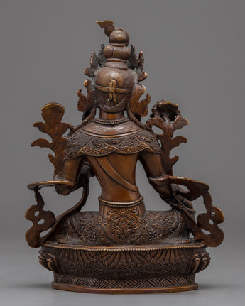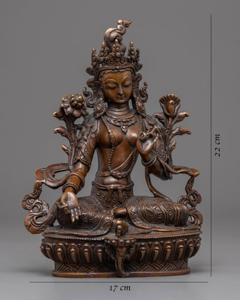 This Green Tara Guru statue depicts the female deity wearing a crown adorned with five jewels, holding an utpala flower in her left hand, and making a mudra of generosity with her right hand. She is shown in a seated position and ready for action. The statue is made of oxidized copper, crafted flawlessly by skilled artisans who have spent a lot of time decorating it with hammers and chisels. In our studio, we created this hand-carved Tibetan Sgrol-lang statue. Our team of sculptors is skilled artisans whose abilities have been passed down through many generations. We specialize in creating accurate and detailed sculptures of sacred Buddhist deities.