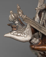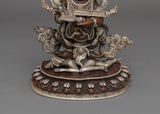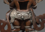 This majestic Protector Deity, Sakya Mahakala Statue, is 10.4 inches tall, beautifully fashioned from oxidized copper, and embellished with stunning silver-plated ornamentation. The statue has a 6.9-inch base and weighs 2.19 kg, making it a remarkable yet small spiritual addition to any meditation room or shrine. Sakya Mahakala is adored in Tibetan Buddhism as a ferocious guardian god who protects practitioners and helps them overcome hurdles on their spiritual journey.