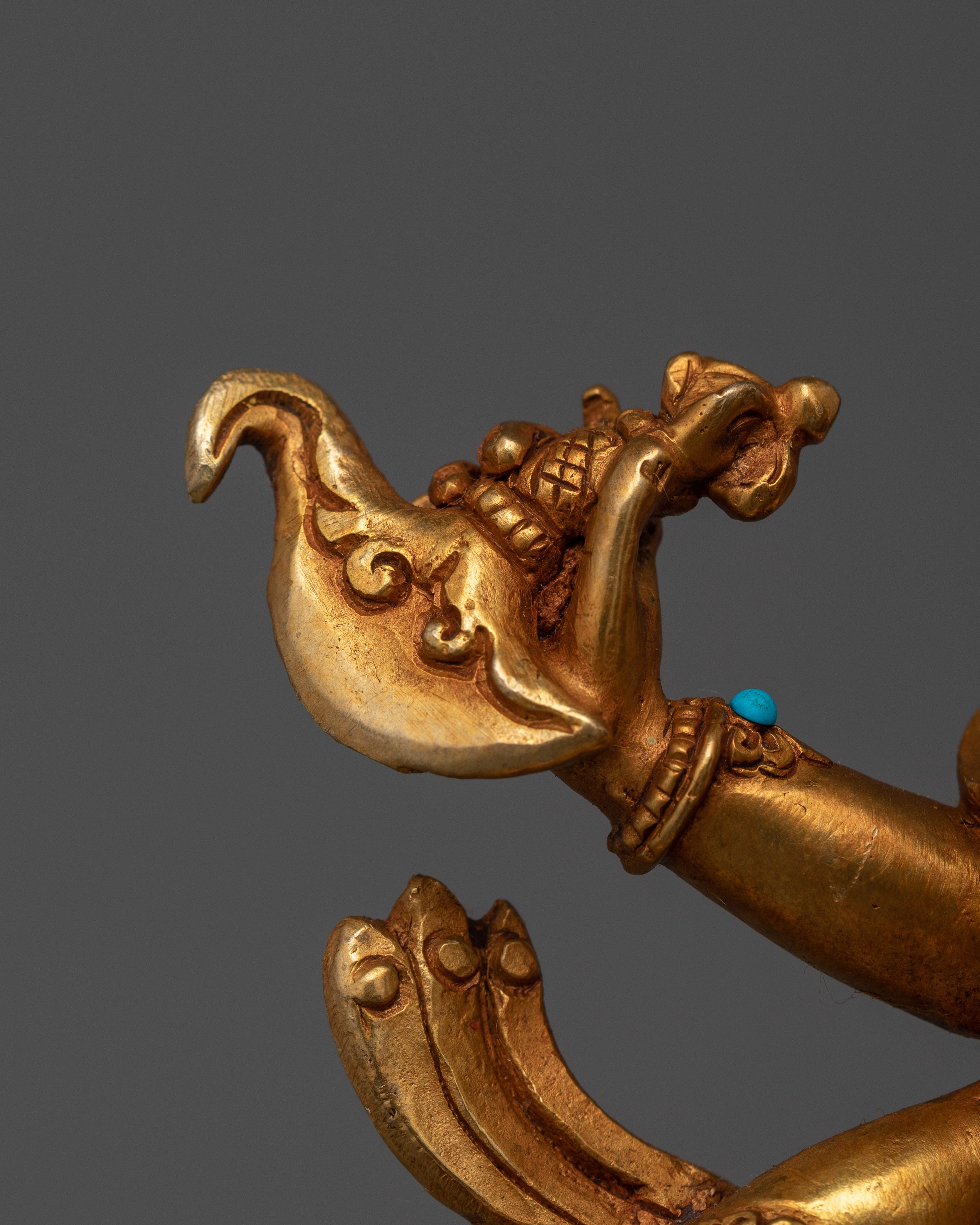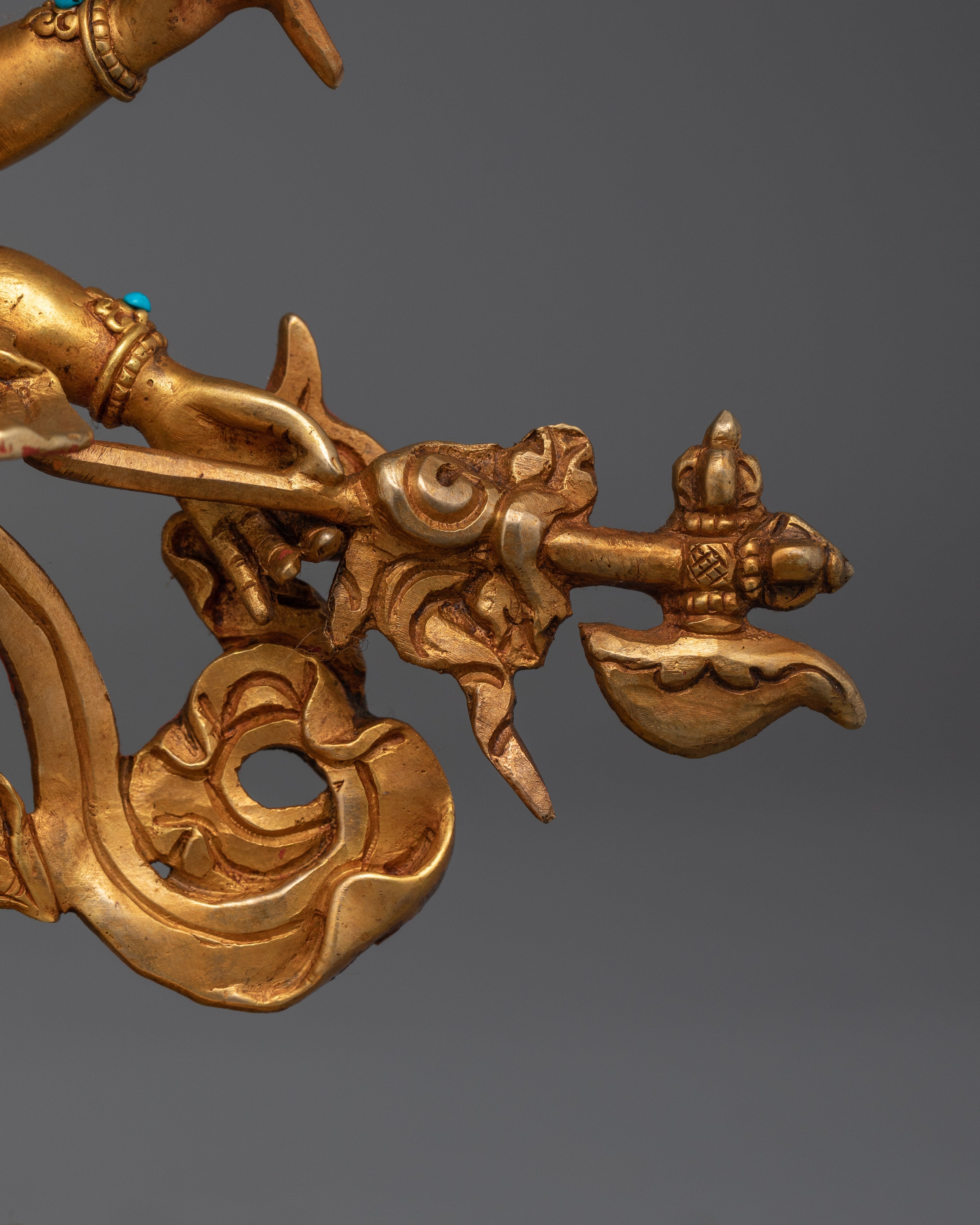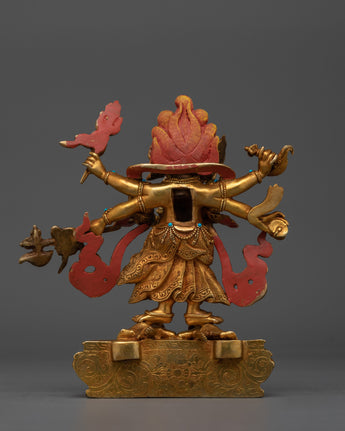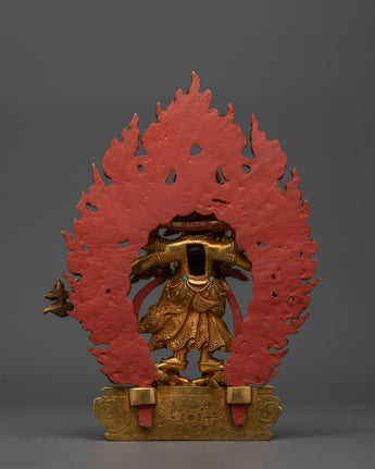 The deity stands atop a moon disc lotus seat bearing three pairs of arms, each holding an item characteristic of his iconography, as a fiery nimbus surrounds the deity's body. He can be seen holding a vajra, a vajra-handled knife, a trident, and a skull cup filled with blood. This all represents his association with purity, wisdom, and compassion. The deity's wrathful facial expression is highlighted with acrylic paints.