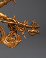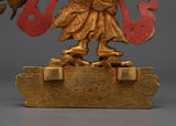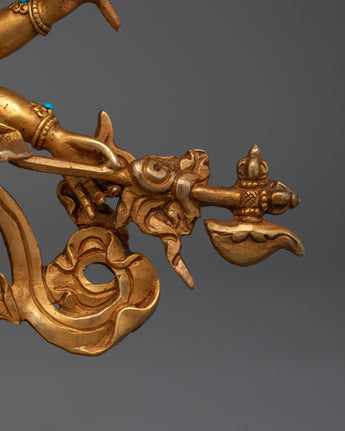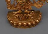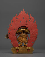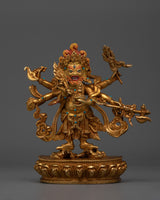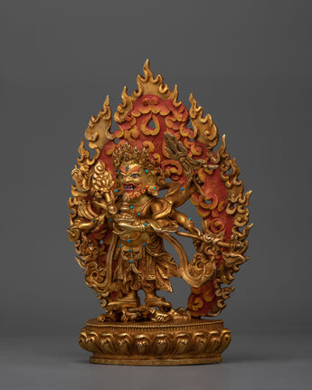 The Sacred White Mahakala Statue is 9.6 inches tall, with a solid copper body and brilliant 24K gold plating. The rich intricacies of the gold and acrylic paintings bring the protecting and plentiful energy of White Mahakala to life, making it a must-have spiritual aid for any meditation area or shrine. This petite yet powerful statue, sitting on a 6.7-inch base and weighing 1.78 kg, is ideal for invoking White Mahakala's blessings of protection and wealth.