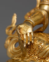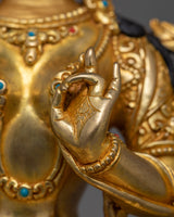 Serene Nature The Green Tara Statue is 9.3 inches tall, with an elaborately made copper body and 24K gold gilding. This beautiful representation of Green Tara, enhanced with vivid gold and acrylic paints and intricate hand-carved jewels, represents the compassionate and serene nature of the adored Buddhist deity. The statue has a solid 7.7-inch base and weighs 2.30 kg, making it an ideal centerpiece for a personal shrine or meditation room.
