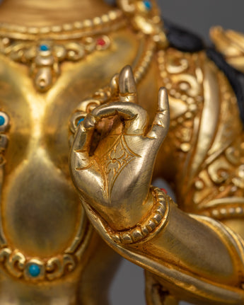 Green Tara, the goddess of rapid action and compassion, is seen seated on a lotus throne with her right hand in the varada mudra, indicating her generosity and eagerness to assist all beings. Her left-hand holds a blue utpala lotus, which symbolizes purity and spiritual enlightenment. This statue embodies Green Tara's peaceful yet strong presence, making it ideal for daily meditation, prayer, or devotion, bringing her protective and loving energy into your home.