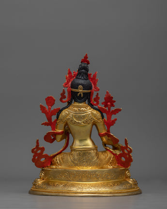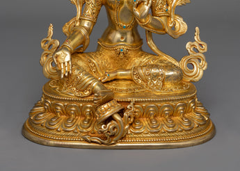 Green Tara is a bodhisattva who embodies swiftness and compassion and is Honored in Tibetan Buddhism. She's portrayed as a gorgeous young figurine decked out in decorations. She's frequently sat in a relaxed position with one leg outstretched, poised to answer admirers' summons. The green hue of Tara's body represents life and her connection to charitable endeavors. As a mother figure, she provides beings on their spiritual path with support, protection, and direction. Devotees access Green Tara's compassion and support through prayers and visualizations, using her constant guidance to help them overcome challenges and achieve spiritual goals.