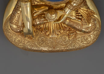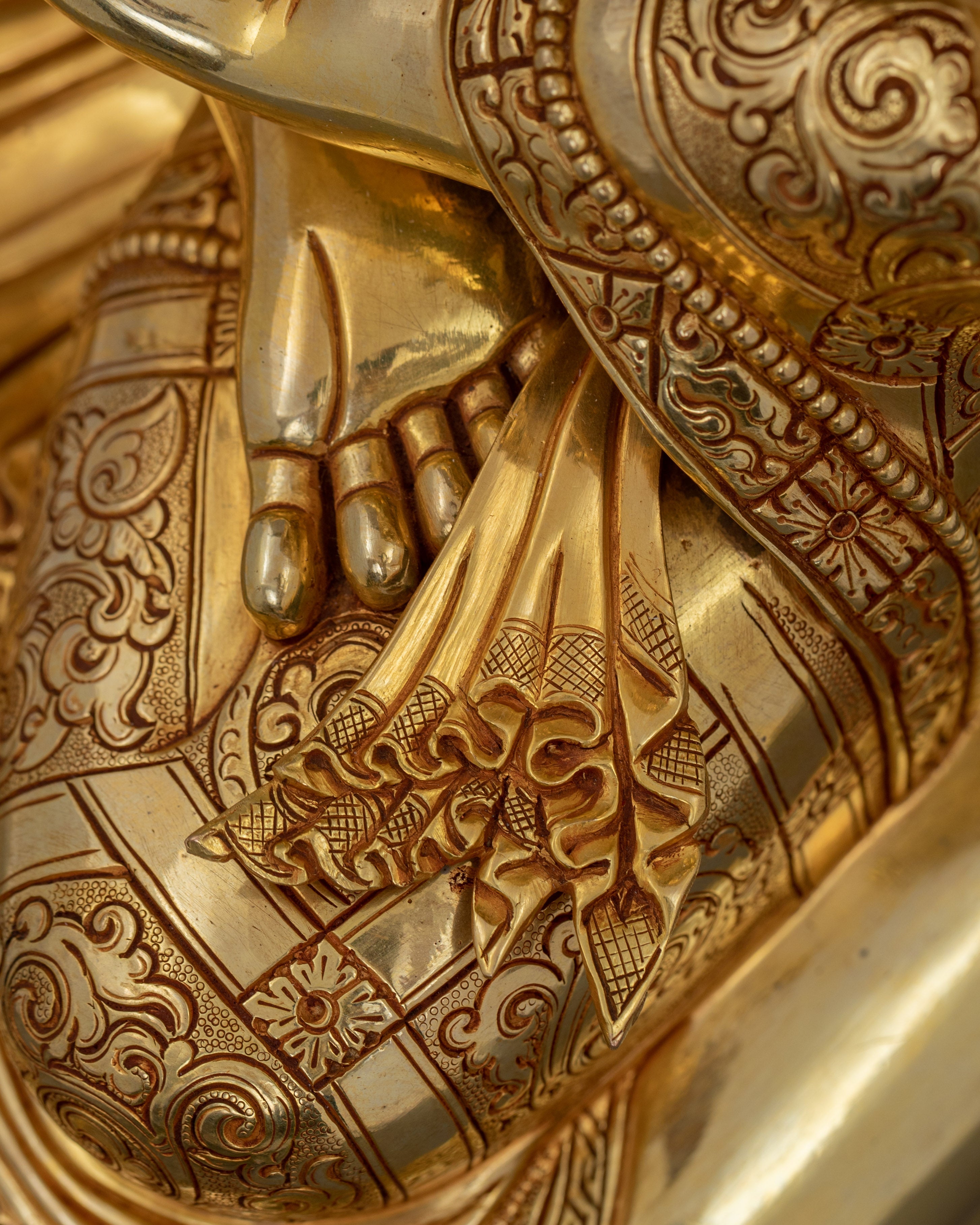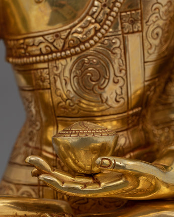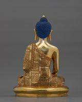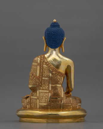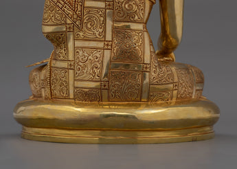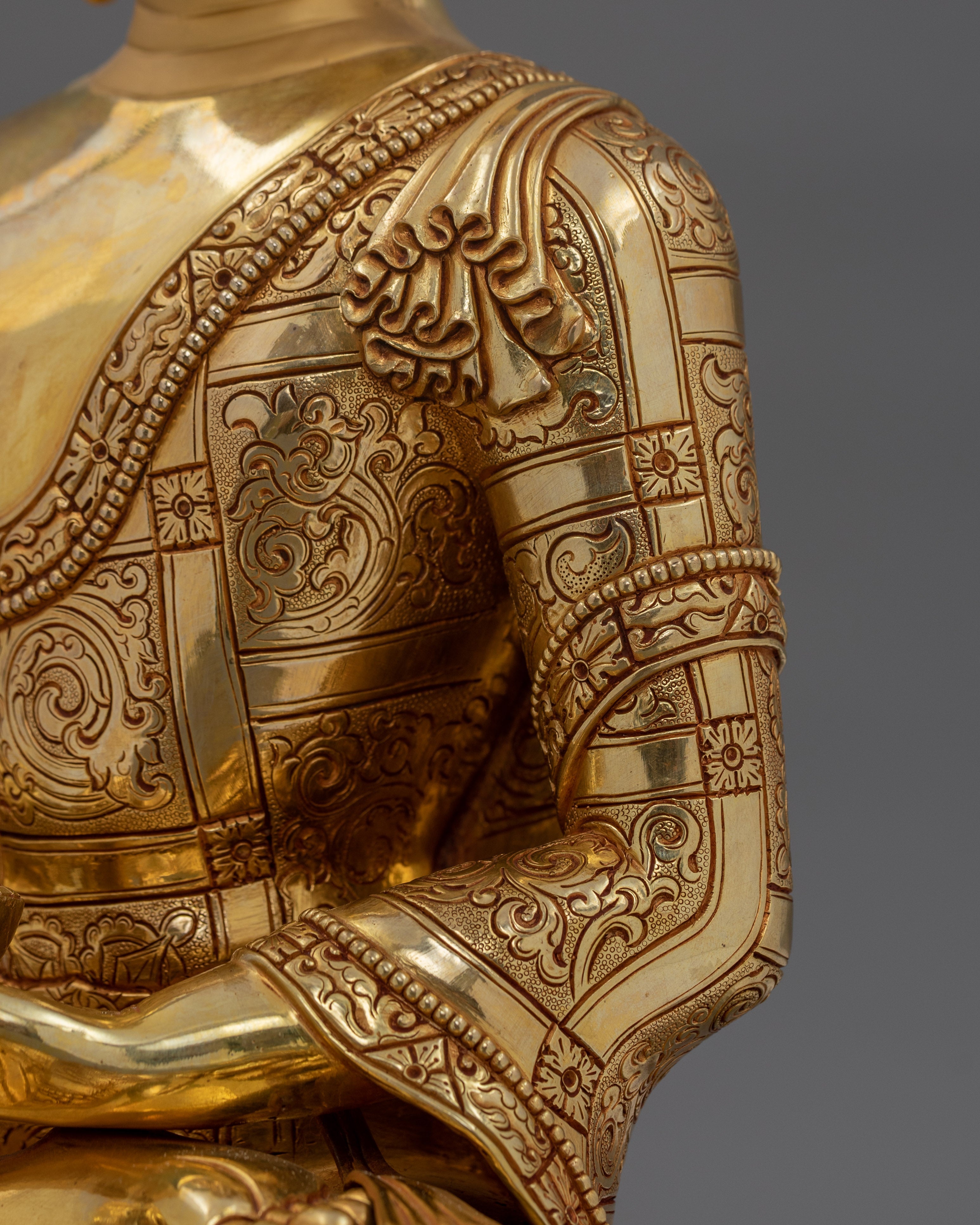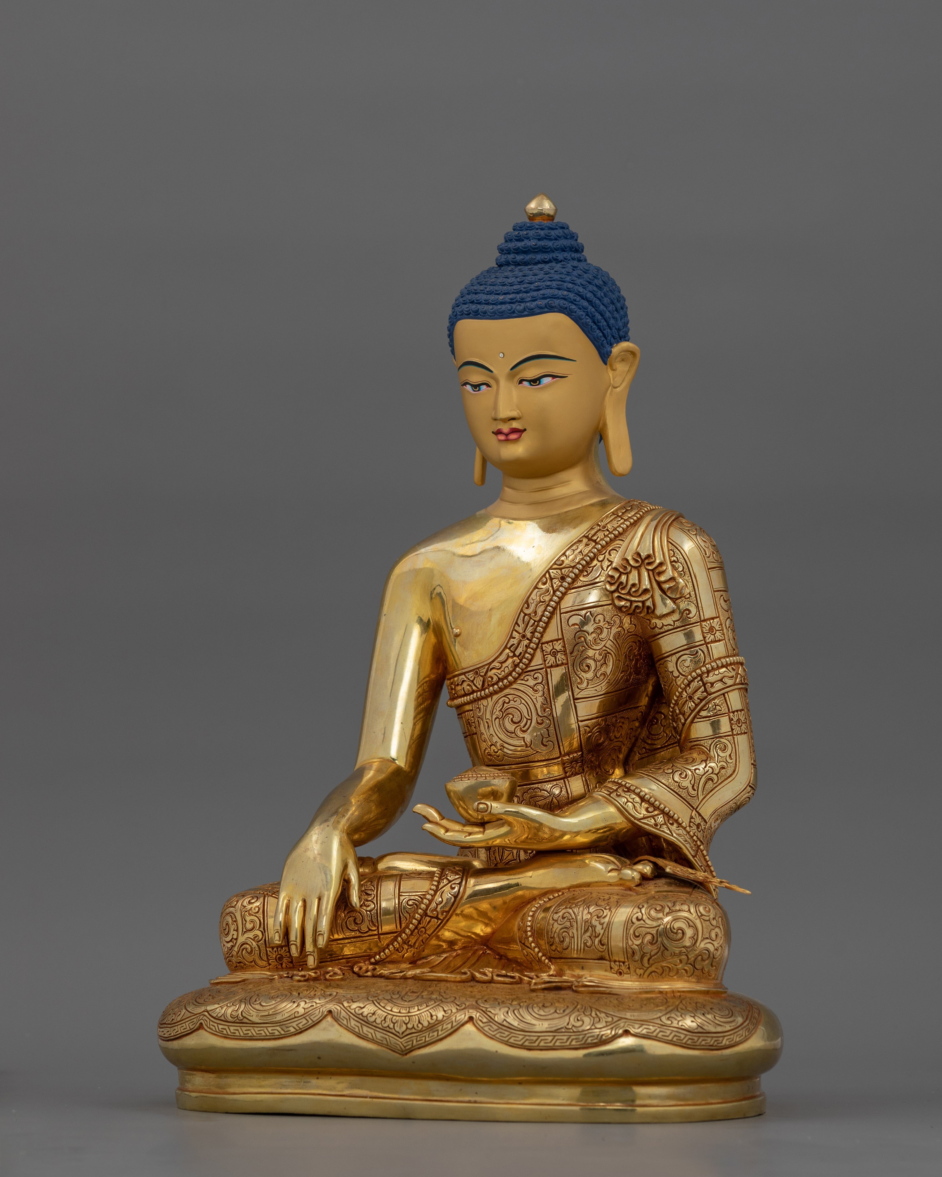 Shakyamuni Buddha Enlightened Figure is 16.3 inches tall, precisely fashioned from pure copper, and embellished with 24K gold gilding. Every detail of the Buddha is brought to life via meticulous gold and acrylic paints, from his tranquil look to the beautiful folds of his robes. The statue, which sits on an 11.4-inch base and weighs 8.10 kg, adds a strong and spiritual presence to any meditation area or shrine.