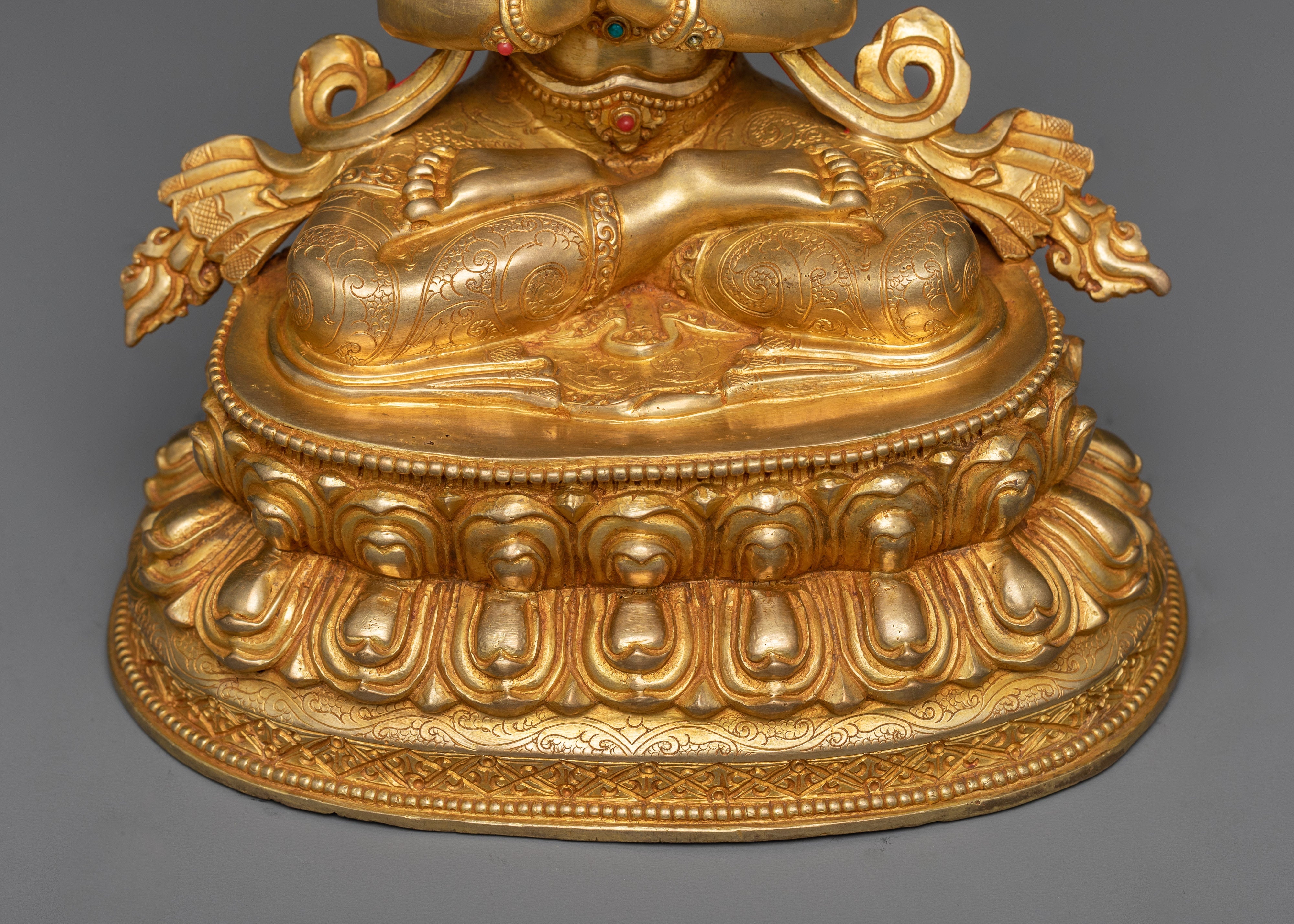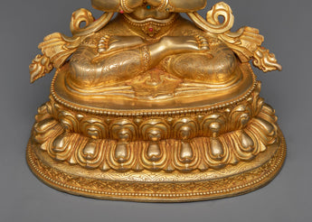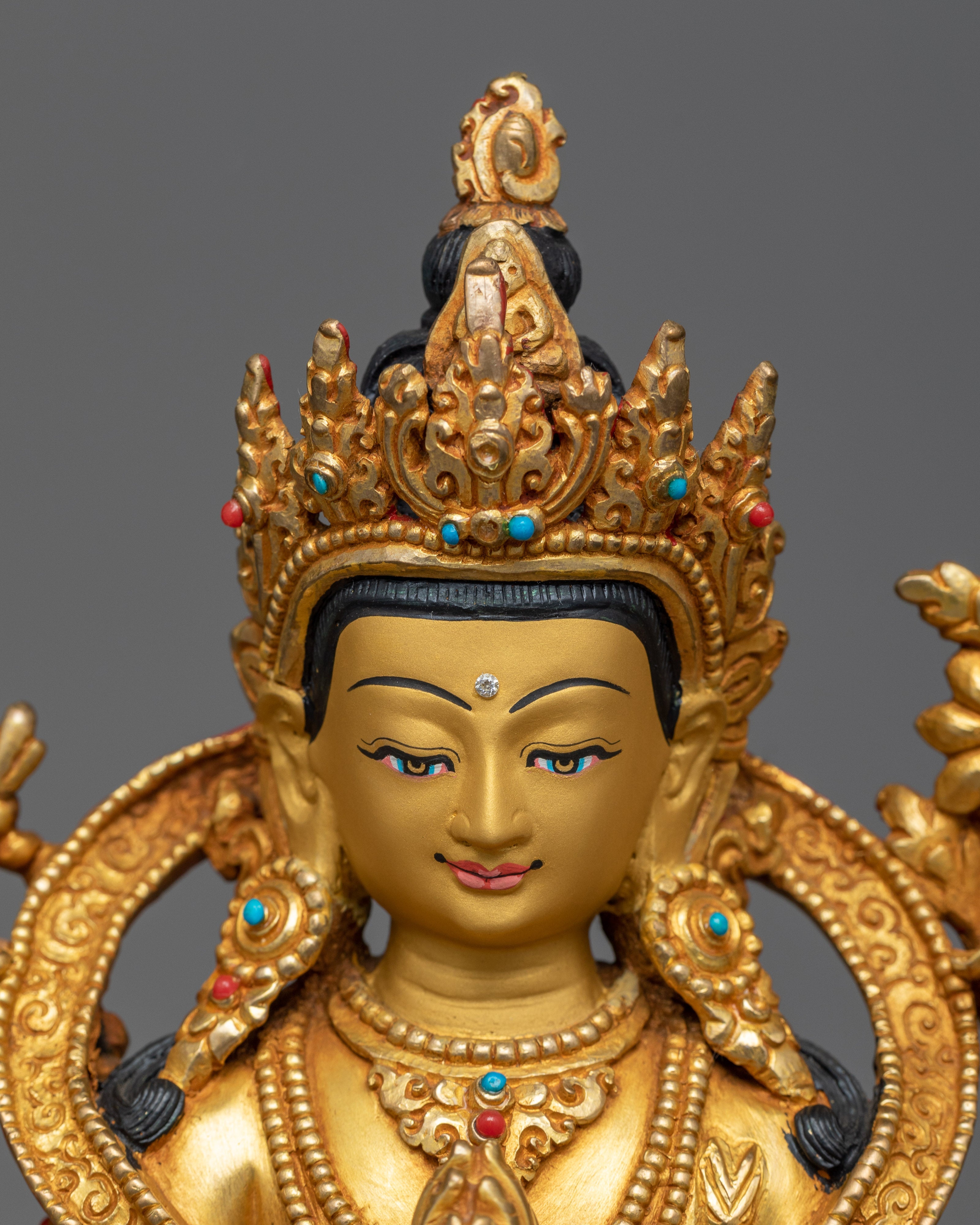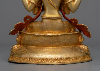 Introducing the Chenrezig Idol, a magnificent depiction of the Bodhisattva of Compassion, admired for his unending compassion and empathy throughout Tibetan Buddhism. This idol, which stands 9.4 inches tall on a 6.6-inch base and weighs 1.91 kg, depicts Chenrezig's gentle embrace and calm grace. This artwork, made of a copper body and embellished with intricate gold, acrylic paints, and 24K gold plating, embodies the Bodhisattva's radiant kindness and spiritual purity.