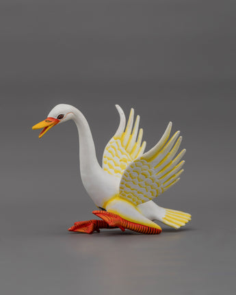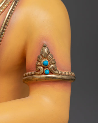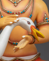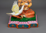 Our Buddha Sculpture depicts him caring for an injured swan and seated on a throne, worried for it. It represents that the individual who saves a life is worth more than the one who murders or attempts to kill a life as well as Siddhartha Gautam's compassion as he saves a wounded swan, representing his early acts of love and care for all living beings. The depicted Buddha is decorated with jewels and painted in acrylics.