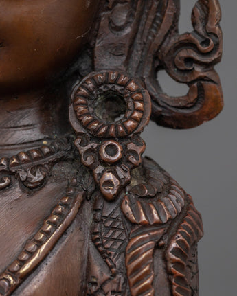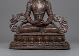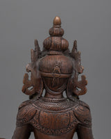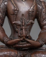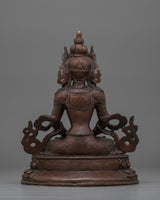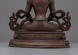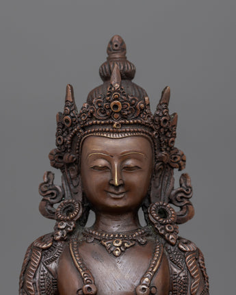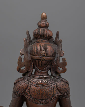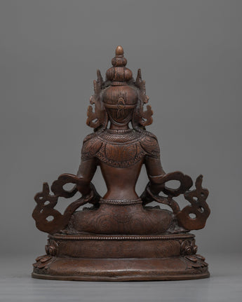 This handcrafted Buddhist art piece, measuring 9.1 inches in height and 7.1 inches in base, is the perfect symbol of longevity and compassion. Made from oxidized copper, this piece weighs 1.67 kg and serves as a beautiful addition to any home or meditation space. Experience the serenity and beauty of this piece.