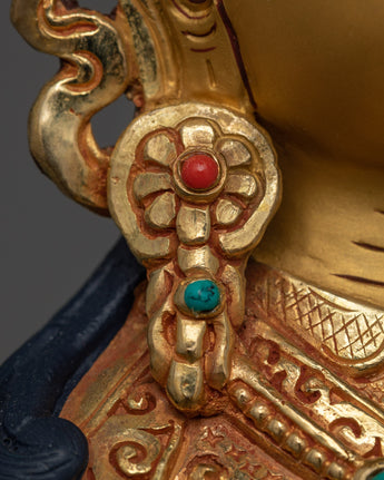 This handcrafted statue represents the Lotus Born Master, Guru Rinpoche's knowledge and spiritual energy. This statue, measuring 10.0" (Height) x 6.3" (Base) and weighing 1.86 kg, is crafted of copper, gilded with 24K gold, and adorned with gold and acrylic paints. This artwork, created by Nepalese artisans, represents the creative skills and spiritual history of Himalayan traditions, making it an inspirational centerpiece for altars, meditation rooms, or sacred decor.