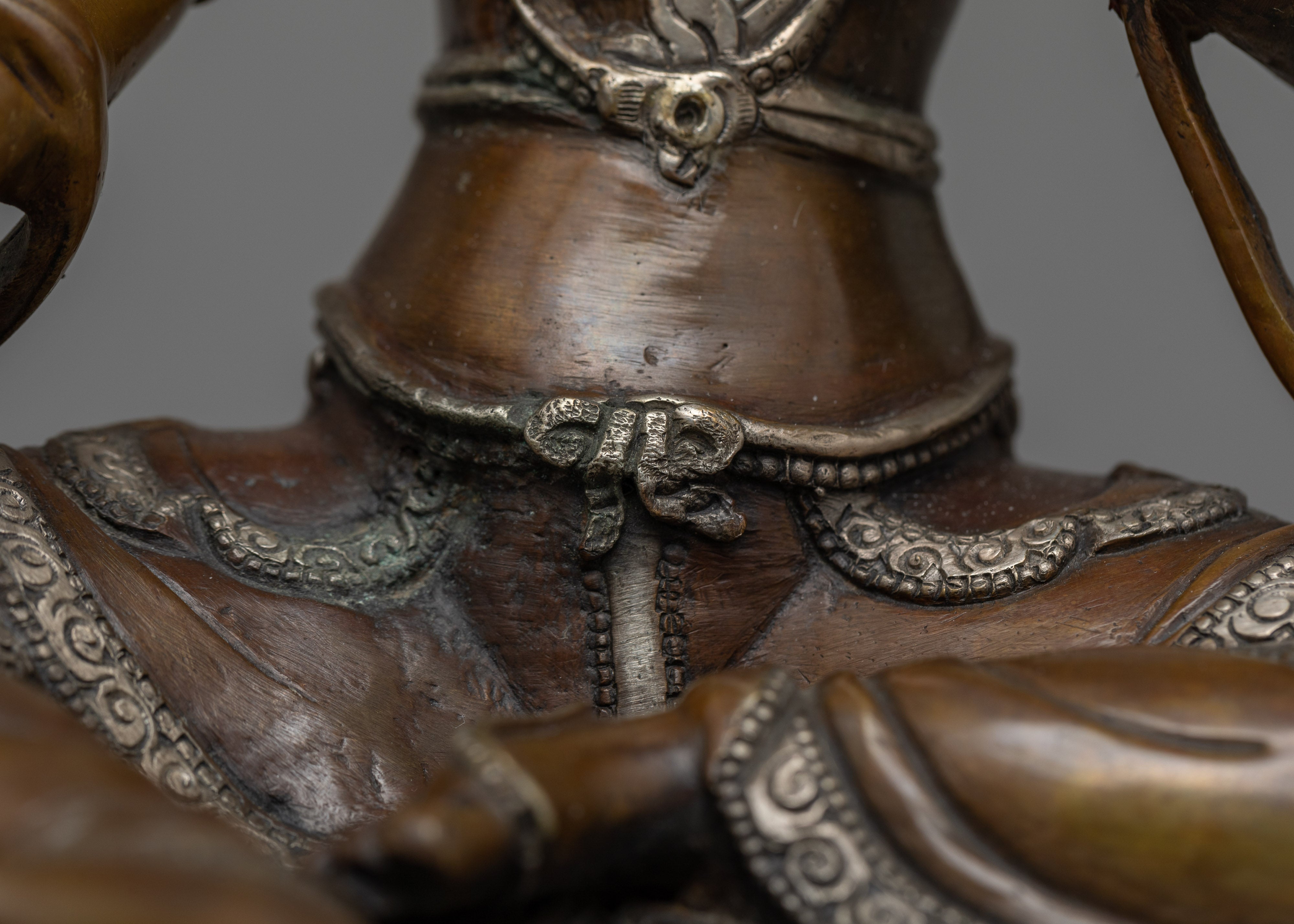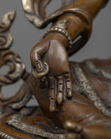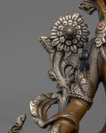 Immerse yourself in the serene presence of our handcrafted Green Tara Statue, an intricate Rising 9.8 inches tall with a base of 7.9 inches. Weighing 2.34 kg, this statue is crafted from oxidized copper, silver-plated, and adorned with detailed gold and acrylic paintings. Handcrafted in the historic city of Patan, Nepal, known for its exceptional metalwork, this statue reflects Buddhist craftsmen's profound spiritual devotion and artistic mastery.