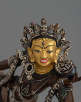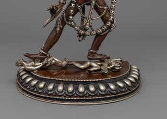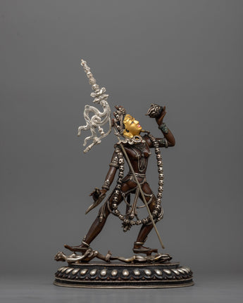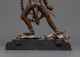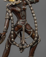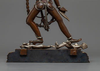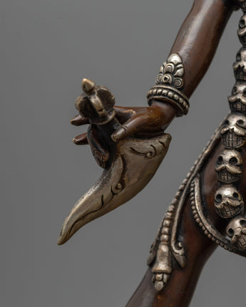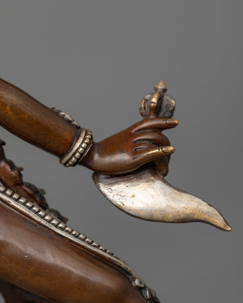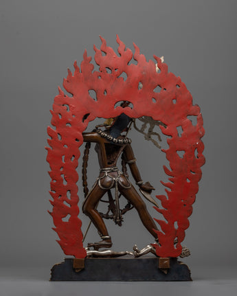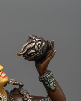 This 15-inch-tall Red Dakini Vajrayogini Statue is made of an oxidized copper body and exquisite gold and acrylic paints. The statue depicts Vajrayogini, the ultimate deity of the Vajrayana tantric path and a formidable Red Dakini, as a violent and sympathetic being. This statue, which represents the energy and transformational potential of the Vajrayogini, is ideal as the focal point of a meditation altar or holy area. Its base is 9.8 inches and it weighs 3.78 kg. The work is given depth and visual impact by the combination of dazzling gold detailing and oxidized copper, which highlights the rich artistry and spiritual symbolism of the sculpture.