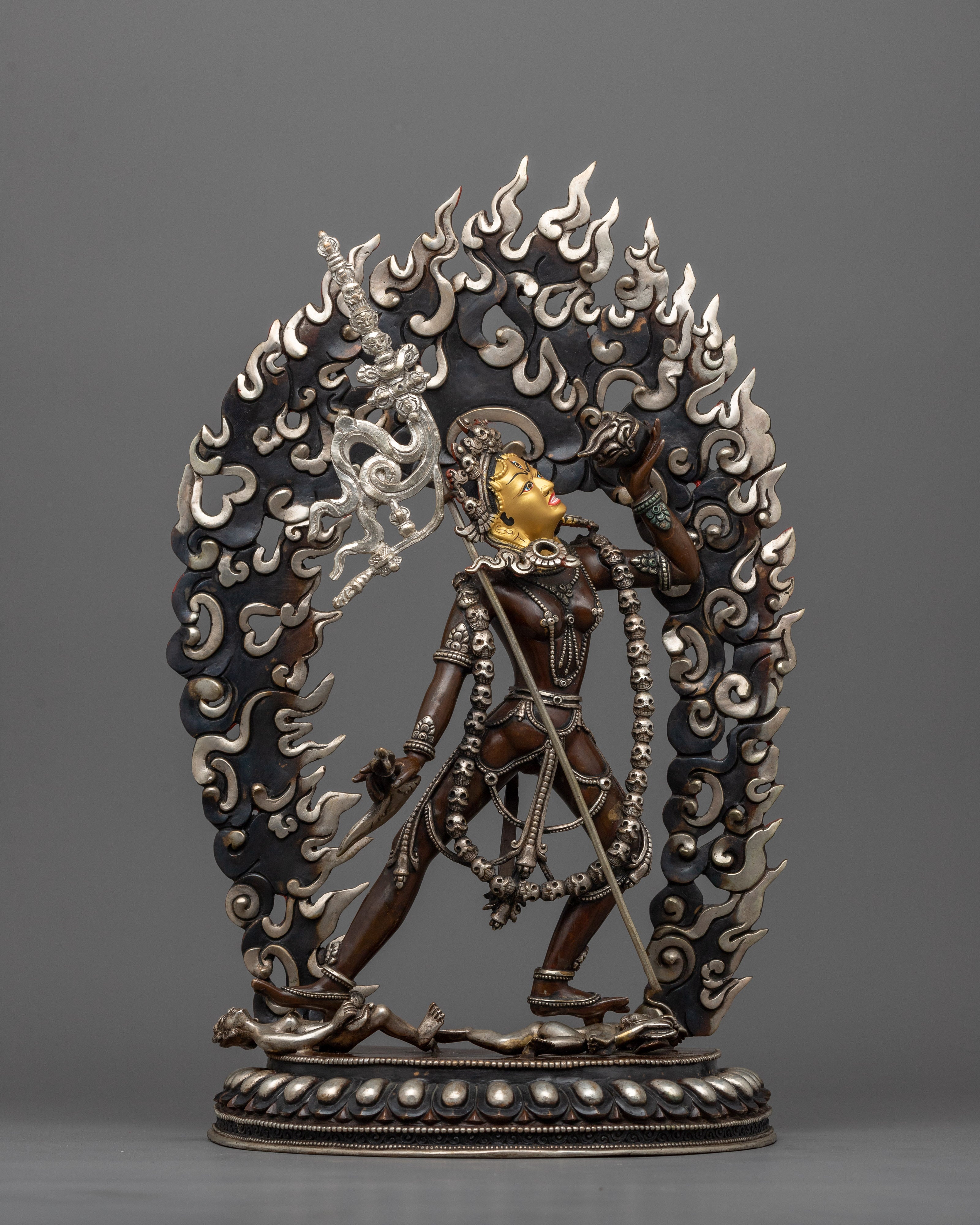 Vajrayogini is shown in her famous dance pose with a kapala (skull cup) in her left hand, signifying change and acceptance of impermanence, and a kartika (ritual curved knife) in her right, symbolizing her ability to cut through ignorance and delusion. Her savage countenance, blazing hair, and crushed figures beneath her feet symbolize her function in conquering negativity and converting inner hindrances into knowledge.