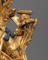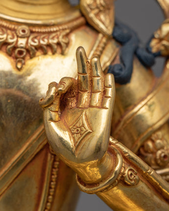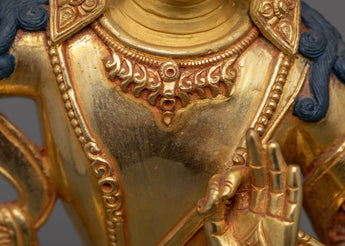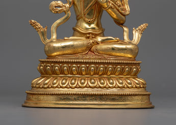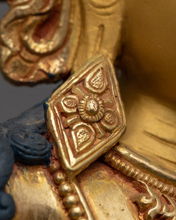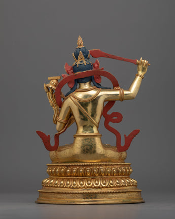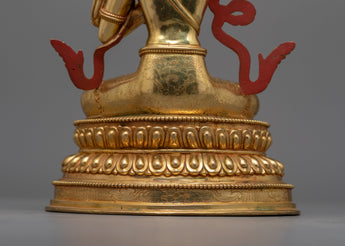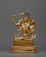 The handcrafted Manjushri statue stands at a height of 9.8 inches (25 cm) with a base width of 6.5 inches (16.5 cm). This statue features a copper body adorned with 24K gold gilding, and gold and acrylic paintings. Representing the Bodhisattva of Wisdom, the statue embodies spiritual clarity and knowledge.