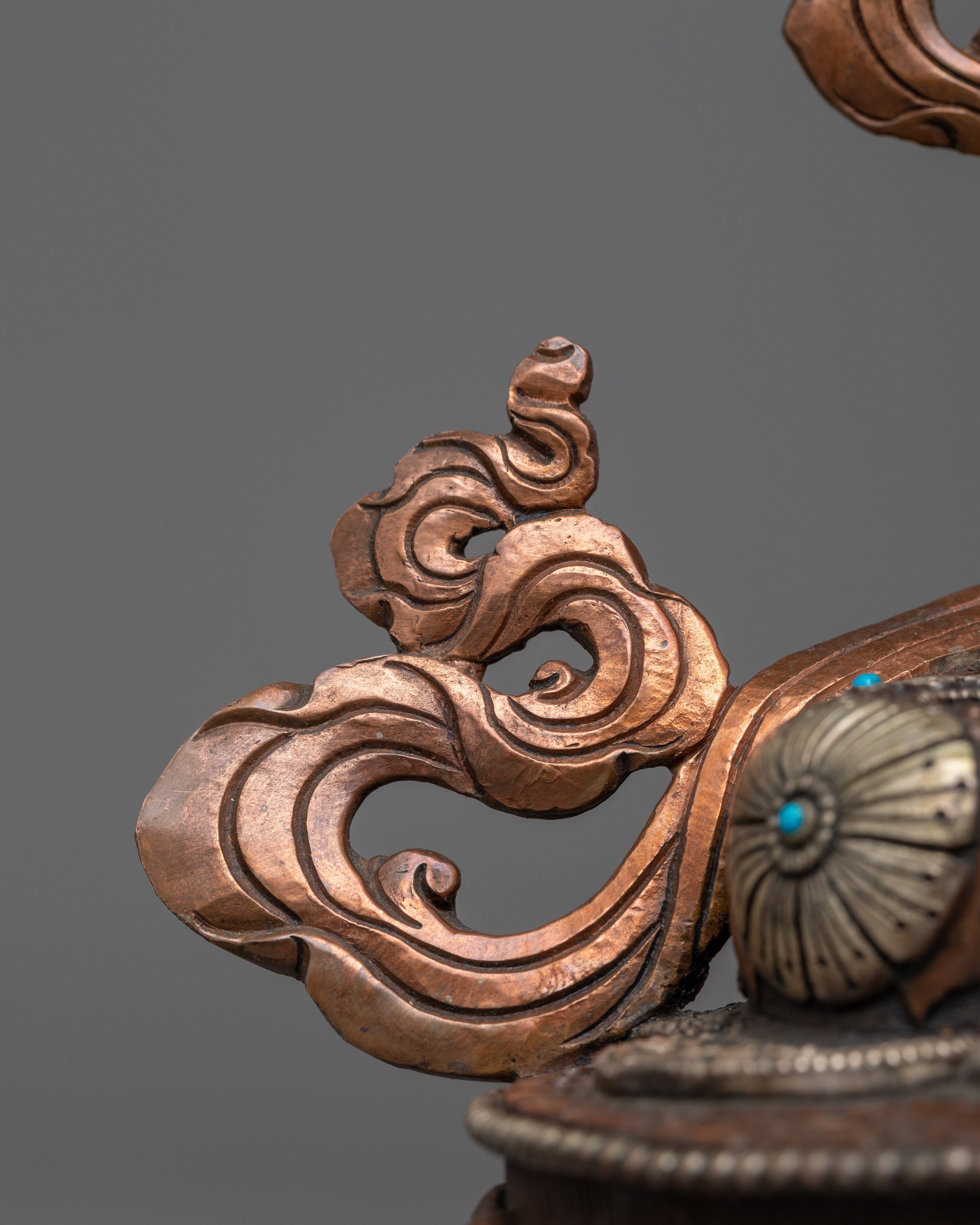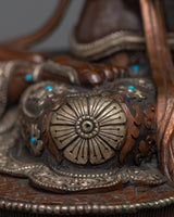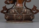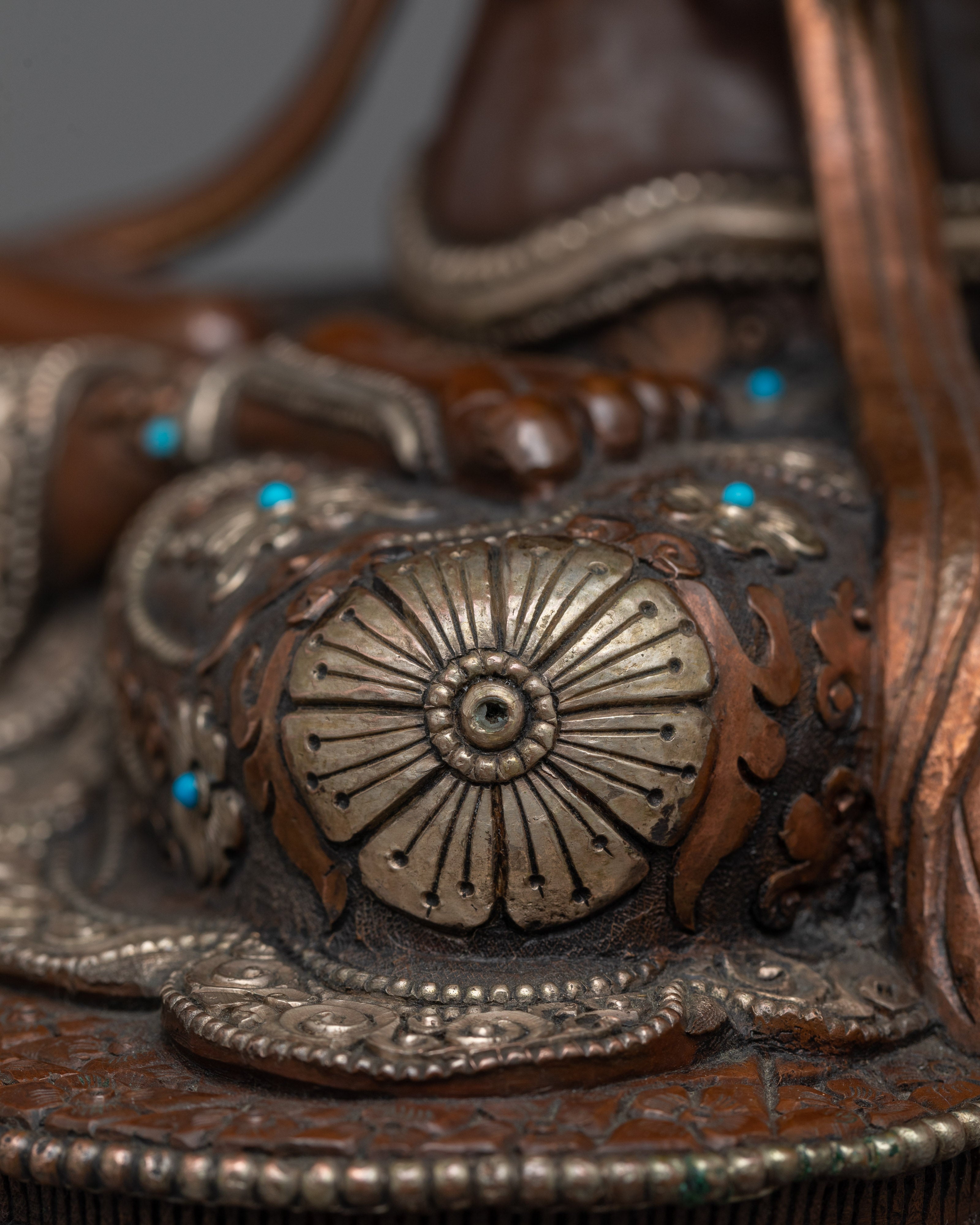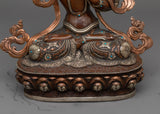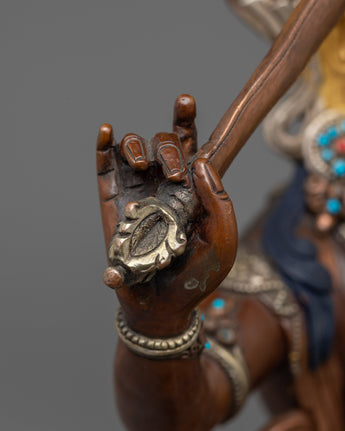 This statue, made of high-quality oxidized copper and decorated with gold and acrylic paintings, combines durability and intricate beauty. The statue's copper body gives it a timeless, antique appearance, while the vivid gold and acrylic embellishments accentuate the intricate craftsmanship and symbolic features. Enhance your spiritual practice and home decor with our Handcrafted Manjushri Statue, a sign of wisdom and enlightenment. Rising 13.4 inches tall with a 10.6-inch base, this masterfully sculpted statue depicts Manjushri, the Bodhisattva of Wisdom. This statue, created by talented artisans, represents Tibetan Buddhism's rich spiritual and creative history.