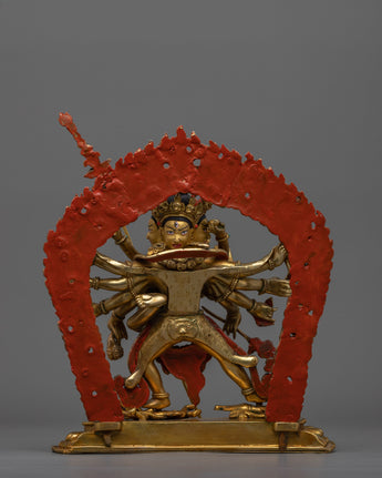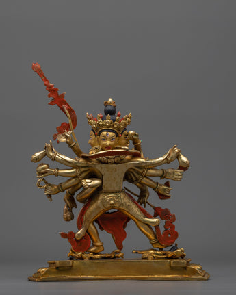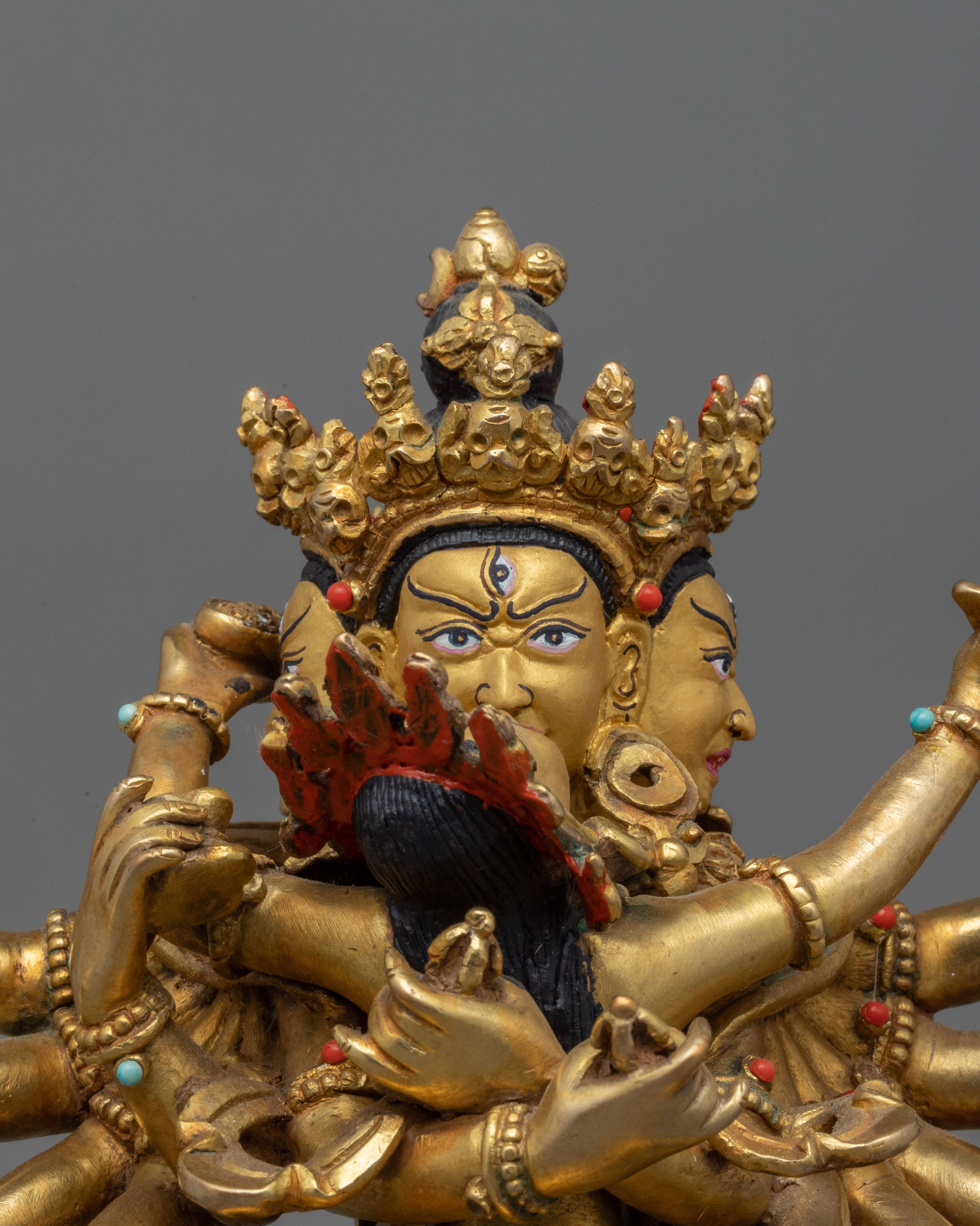 Chakrasambhara with its multifaceted shape, stands in dynamic connection with his consort, representing the harmony of wisdom and compassion. Each head represents a distinct facet of his enlightened qualities, while his numerous arms bear symbolic implements representing control over destructive forces and the way to spiritual freedom. This breathtaking depiction of Chakrasambhara and his deity is not only a magnificent work of art but also a powerful reminder of the transformational power of union and inner awakening. Owning this statue brings a potent symbol of spiritual strength and transcendence into one's life.
