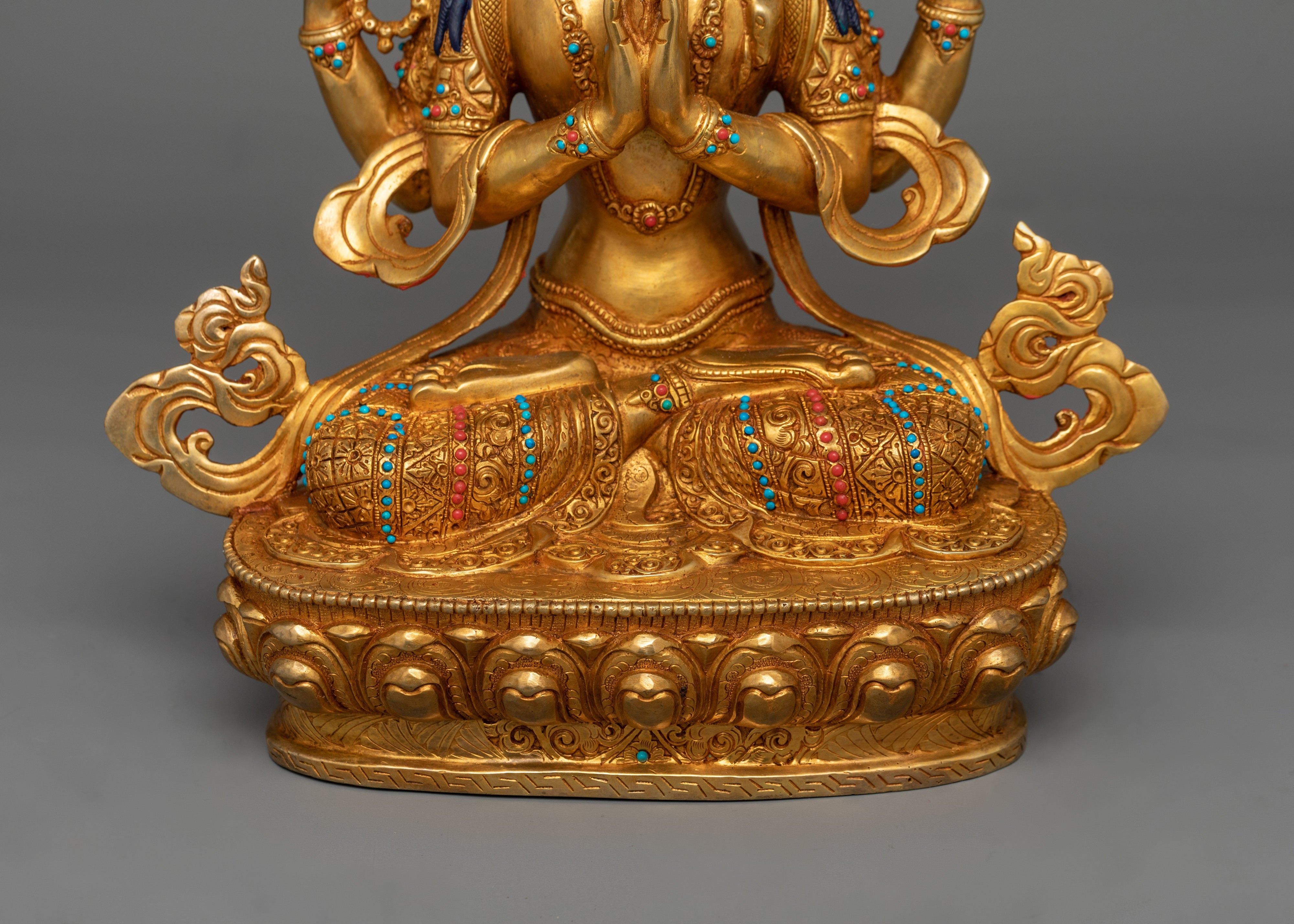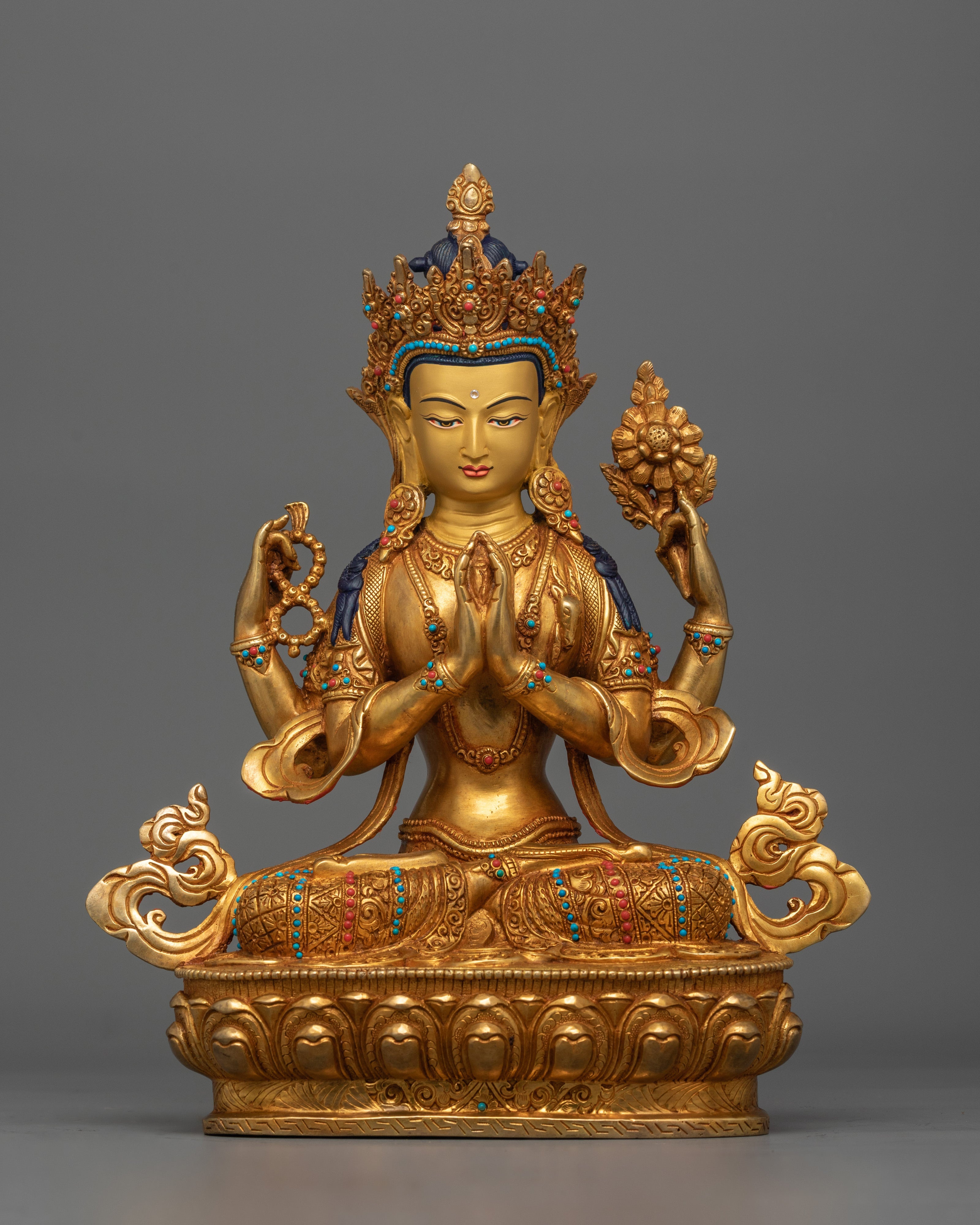 The Chenrezig Serene-Deity statue stands 13.4 inches (34 cm) tall and has a base width of 10.8 inches (27.5 cm). It weighs 4.31 kg. It is meticulously created from copper and has delicate 24K gold gilding, gold and acrylic paintings, and hand-carved gemstones. This gorgeous depiction of Chenrezig, the personification of compassion, is an ideal addition to any shrine, meditation altar, or spiritual decor.