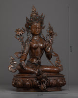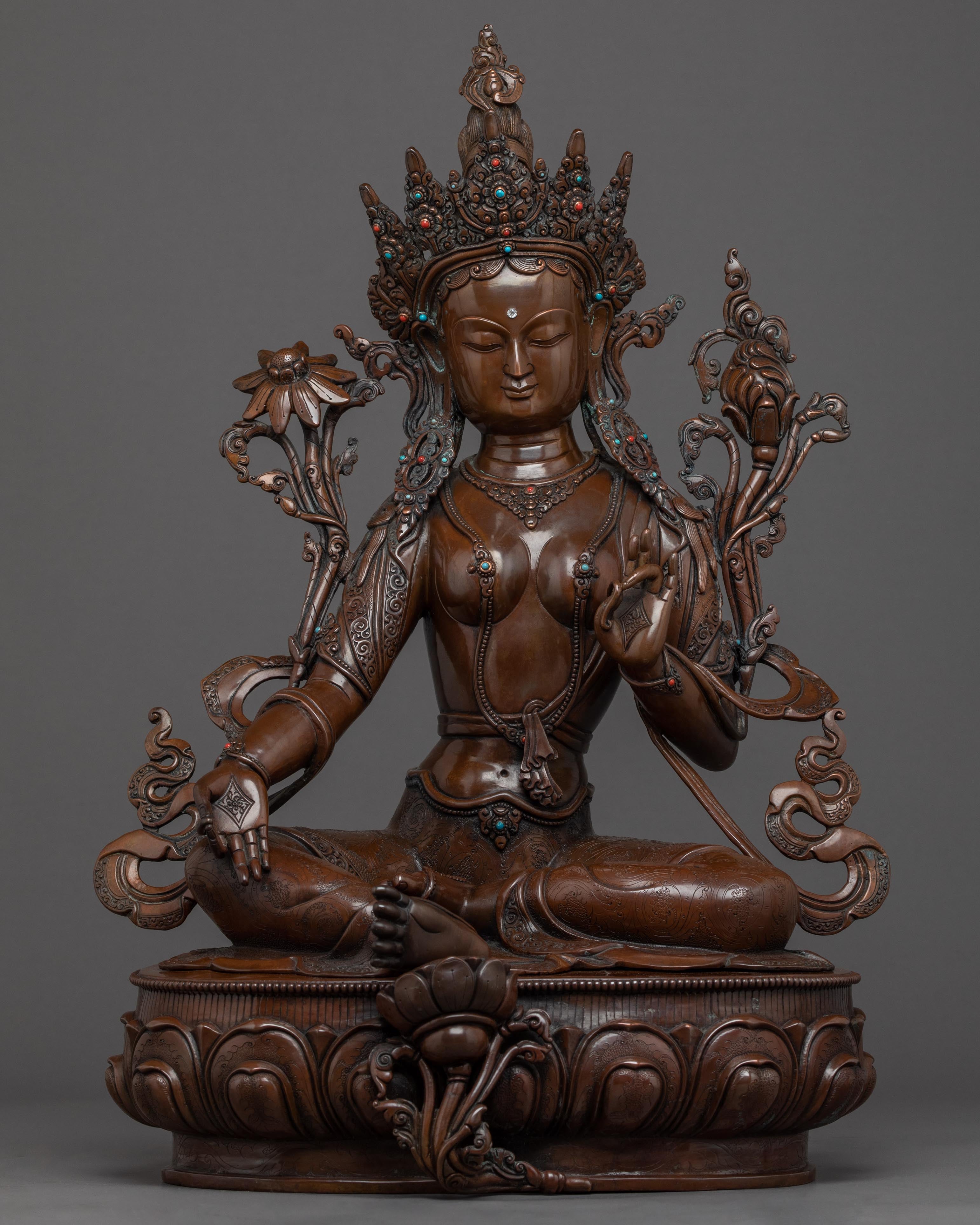 This handmade Green Tara Sculpture was crafted using traditional Himalayan techniques, molded from a pure oxidized copper body that highlights the intricate design patterns of the statue and embedded with numerous gemstones over the various ornaments of the body. The compassion deity is seen sitting on a lotus moon disc lotus with her left hand in the Prithvi Mudra, which symbolizes the fusion of wisdom and compassion, and her right-hand makes the gesture of offering shelter. The materials used in the statue are of the finest quality and will last for many years to come.