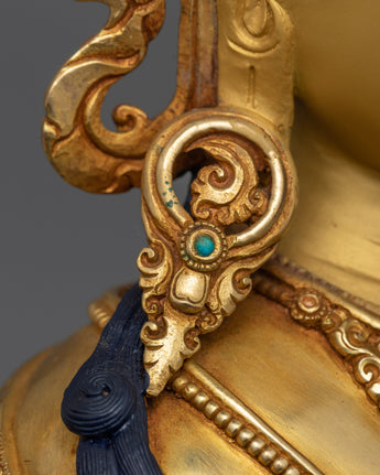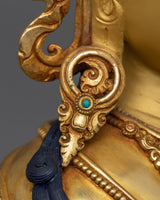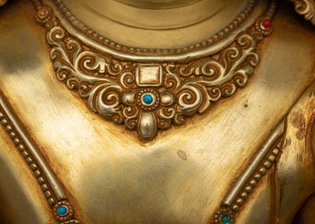 Chenrezig is seated in a meditative posture, exuding calm and peace. His body has been adorned with ornate jewelry, including a necklace that carefully falls across his chest and intricately crafted armlets on his arms. His calm smile expresses genuine compassion, and his eyes are half-closed in meditation. The statue has a detailed crown on top of his head, adorned with shining gemstones that catch the light and add to the piece's overall beauty.