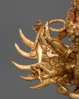 Here in the statue, the deity is depicted standing on the lotus throne with 3 faces, 6 hands, and 4 legs. He holds his consort, Vajravarahi, in a passionate embrace. This union signifies the ideal harmony between knowledge and sympathy. They also possess skull bowls overflowing with the blood of the four maras, representing their enlightened knowledge and triumph over death's powers. The five aggregates are purified by their human skull-adorned crowns, while Krodishvari's lengthy chain purifies the inner winds of skulls. It took us months and months of hard work to complete the statue to make it perfect for decor.