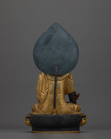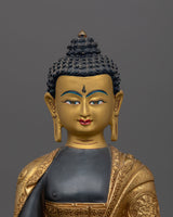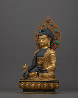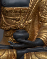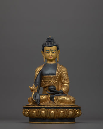 The Healing Energy Bhaishajyaguru Medicine Buddha Sculpture, stands at a height of 15 inches (38 cm) with a base width of 8.3 inches (21 cm), making it a striking and powerful presence. Crafted from a copper body, this statue is beautifully adorned with 24K gold gilding, adding a radiant, sacred touch. The intricate gold and acrylic paintings highlight the Buddha’s serene and compassionate expression, while the carefully placed gemstones enhance its healing energy.