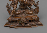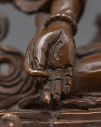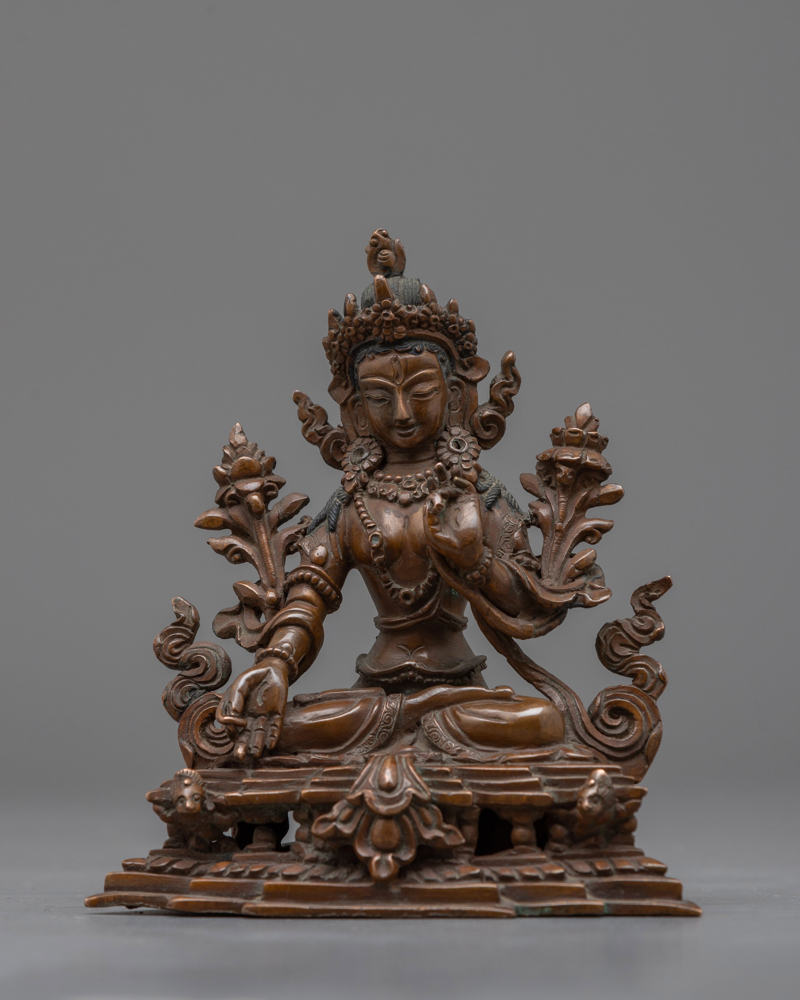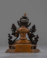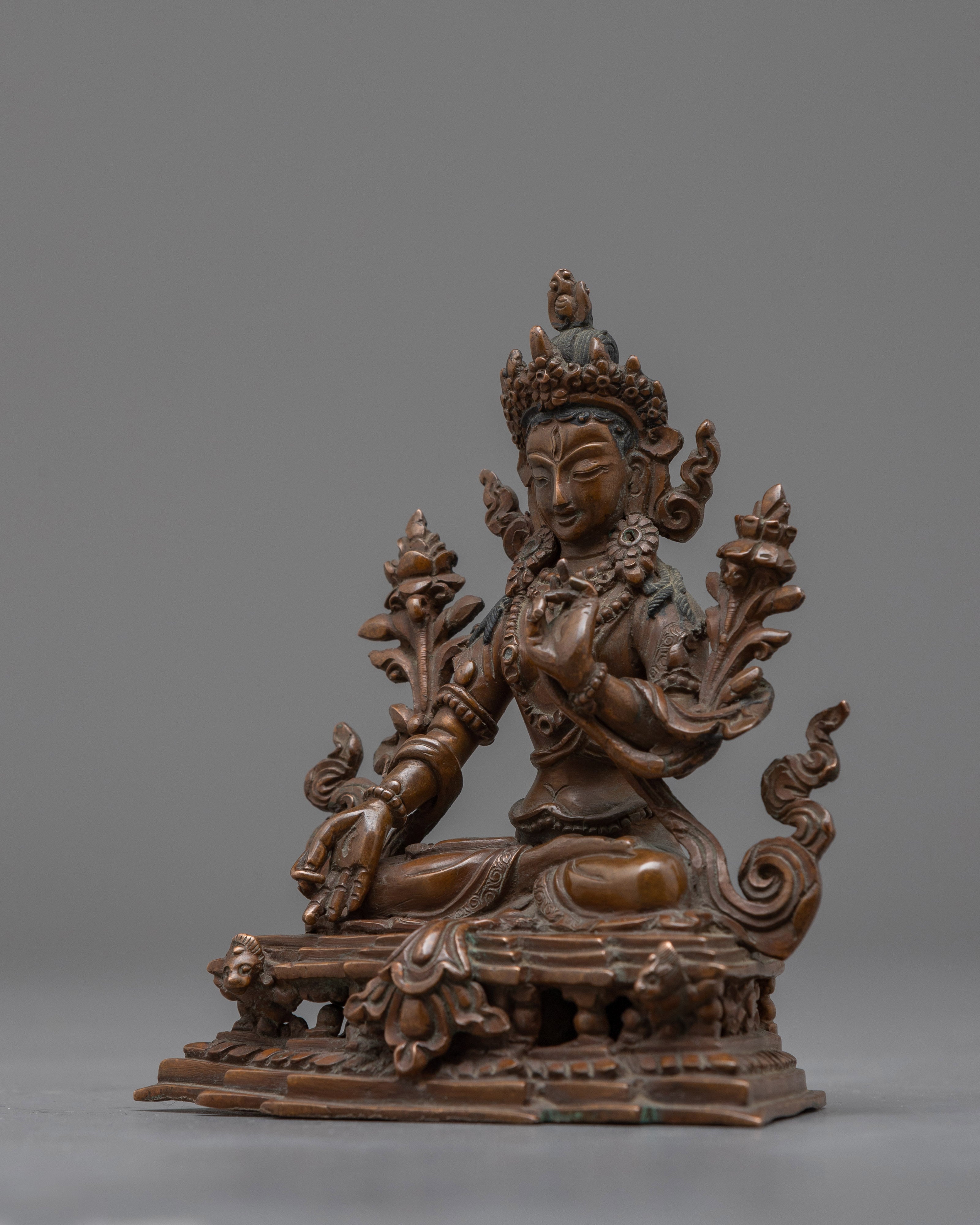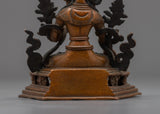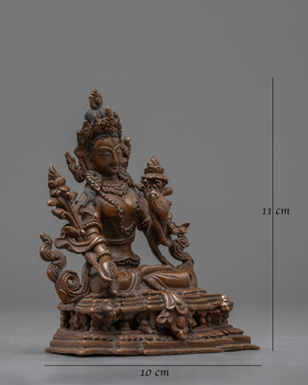 The profound energy of the Healing Goddess, Tara, can enhance your holy area. This beautiful work of art, which stands 4.3"/11cm tall and weighs 0.380 kg, has a finely carved oxidized copper body. Blessed with a transformational presence, White Tara is regarded in Buddhist tradition as the embodiment of healing and compassion. Embrace the White Tara Statue's radiant aura and set off on a path to enlightenment and spiritual development.