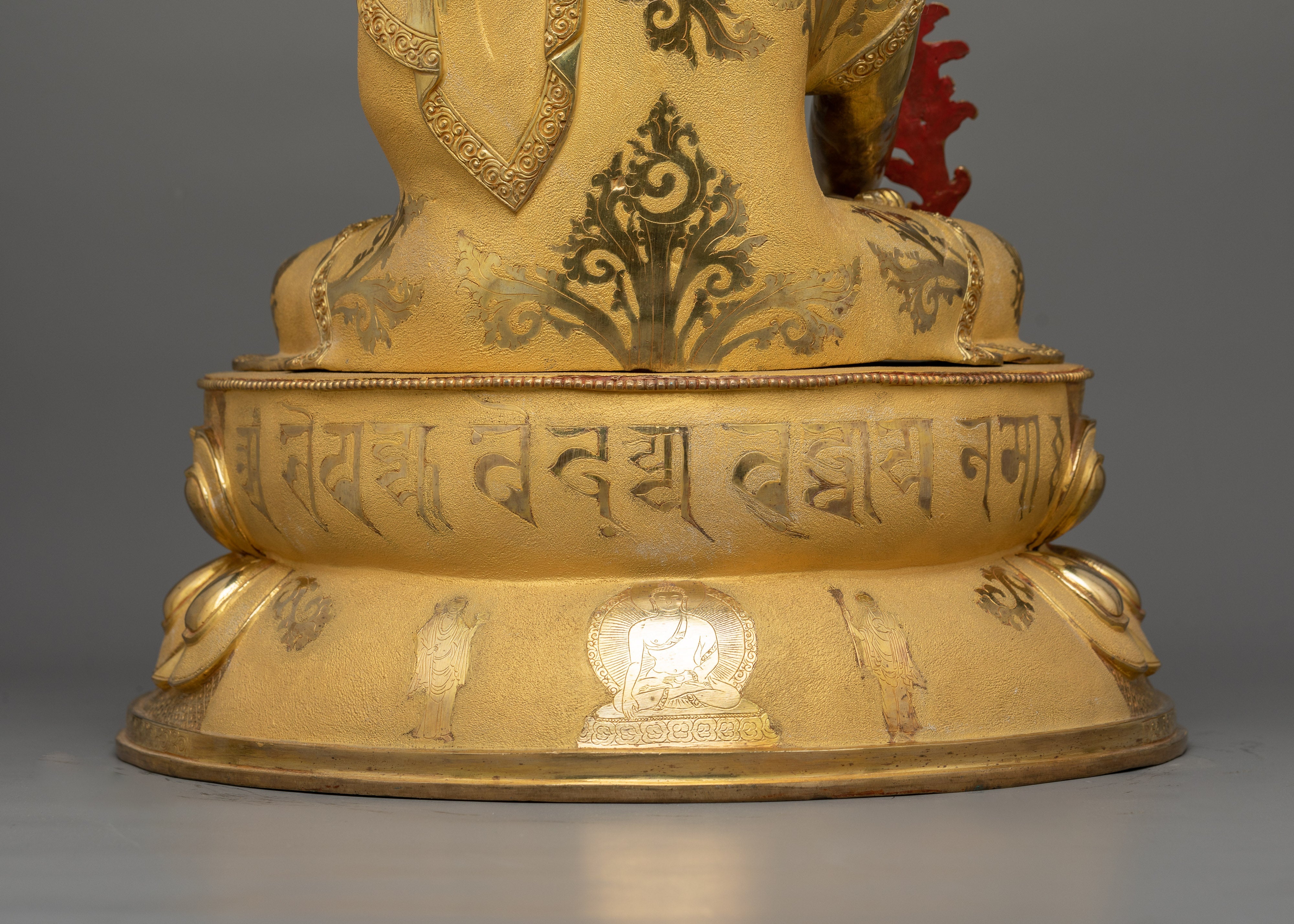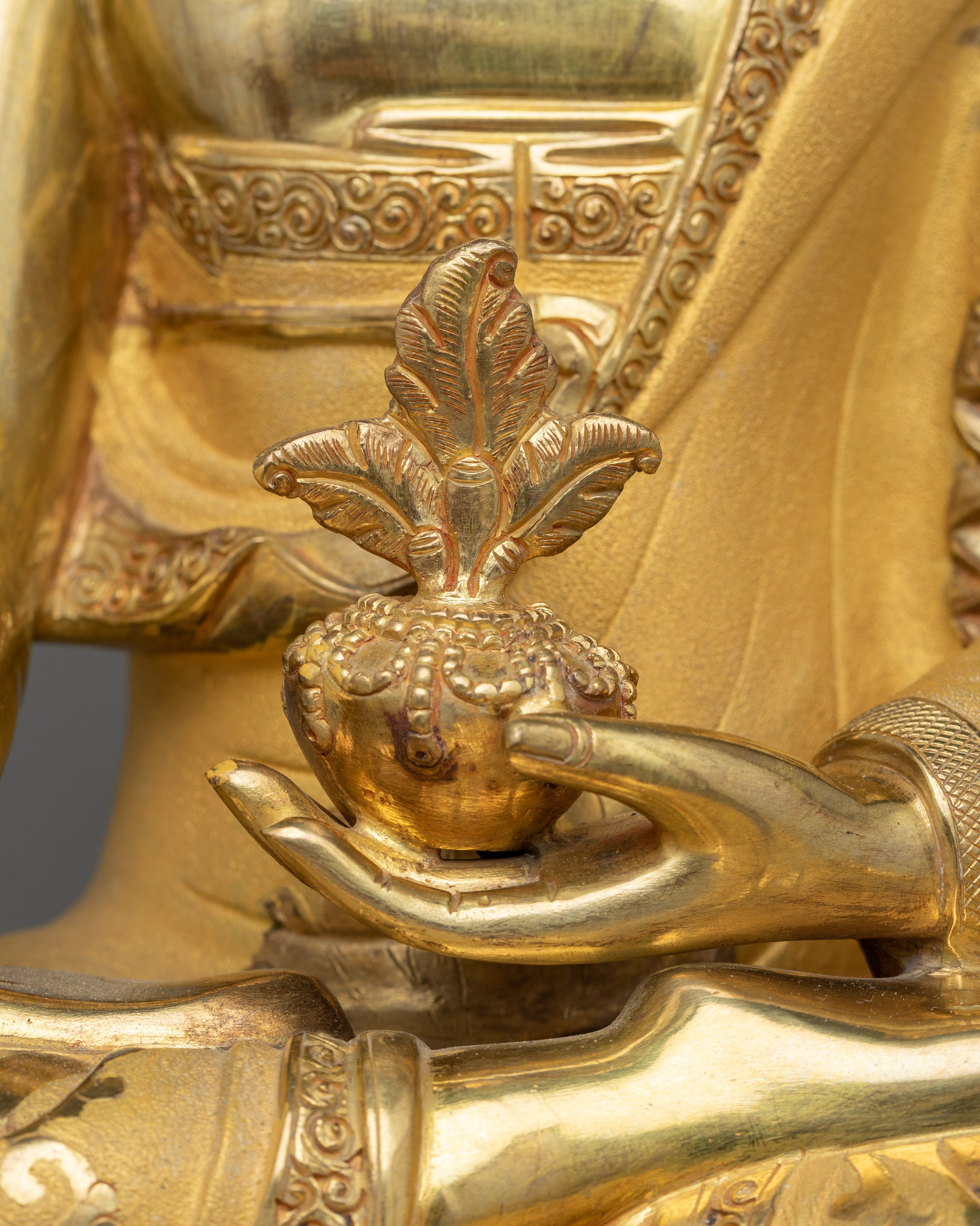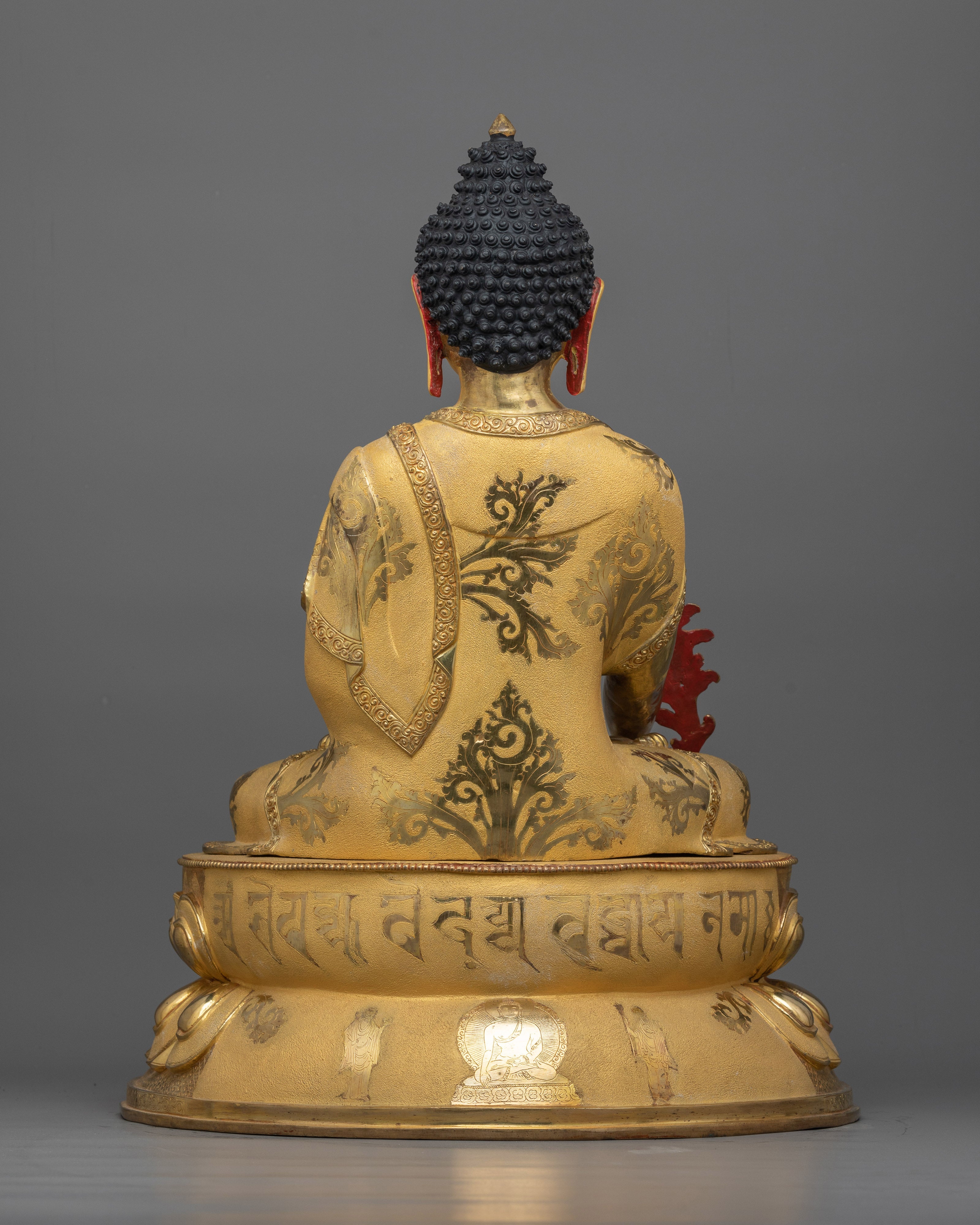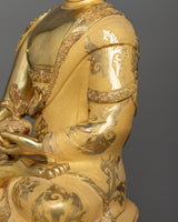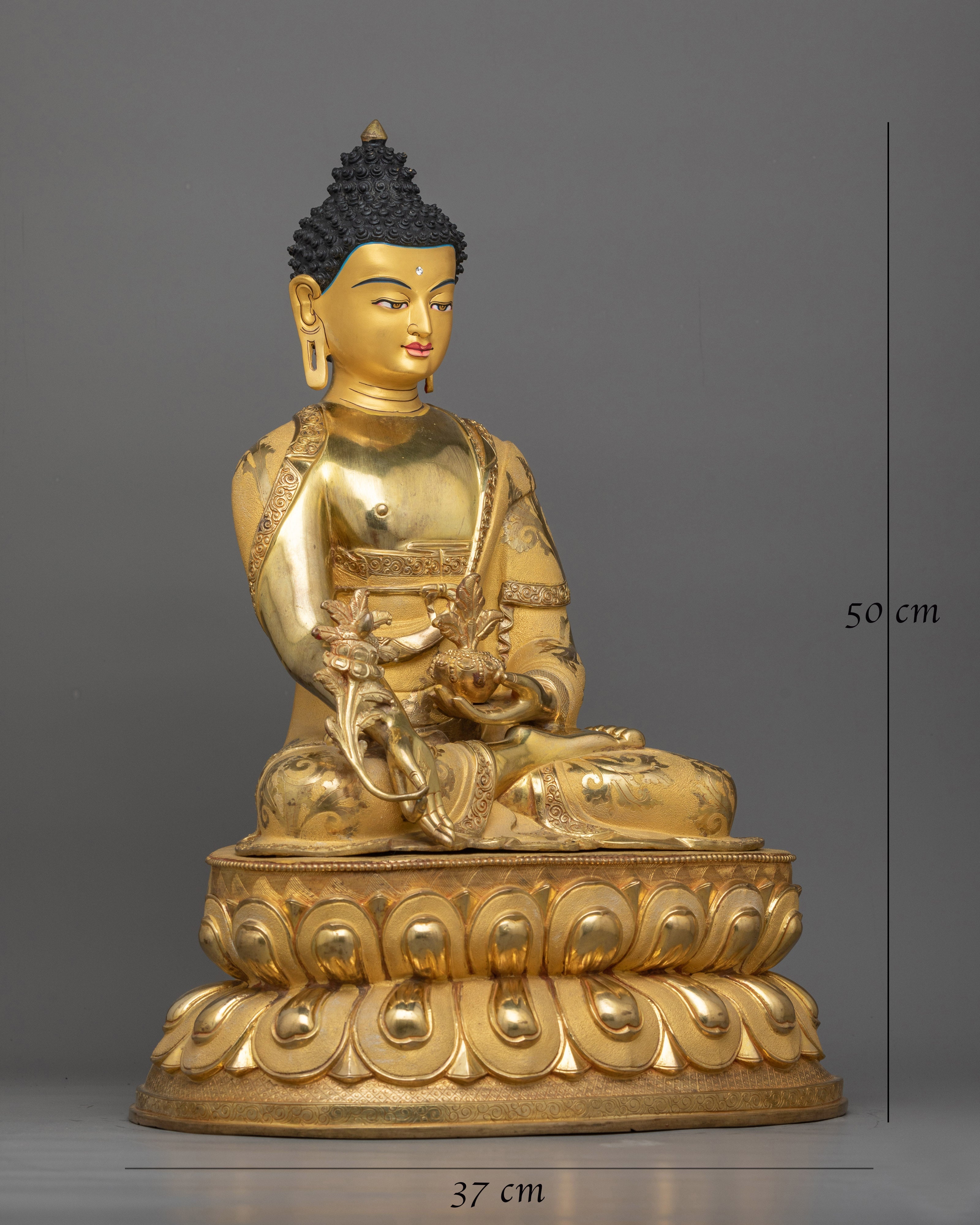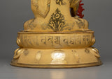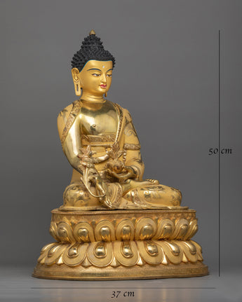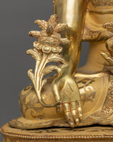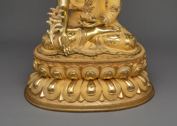 The Healing Medicine Buddha Statue is a magnificent representation of healing grace and compassion that will elevate your spiritual sanctuary. This work of art, which stands 19.7"/50 cm tall and weighs 9.19 kg, has been adorned with elaborate acrylic and gold paints, gilded in 24K gold, and a copper body. When Medicine Buddha is in your sacred place, you experience deep peace and spiritual well-being that motivates you to pursue inner harmony and holistic health.