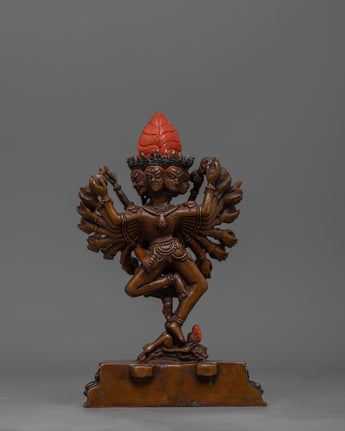 Introduce the magical presence of the hevajra-oxidized statue into your collection; this remarkable piece stands 21.5 cm tall and is skillfully crafted from oxidized copper. The deeper copper finish gives the statue a profound depth, emphasizing the fine details of Hevajra's terrifying visage and the dynamic array of arms in a dance-like pose.