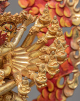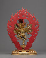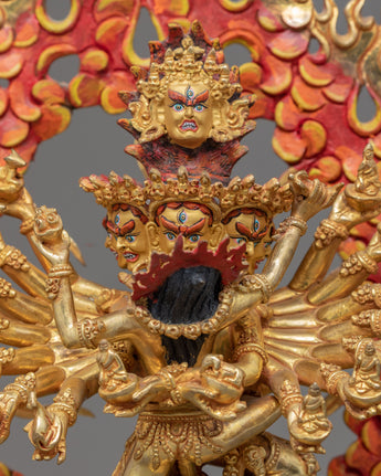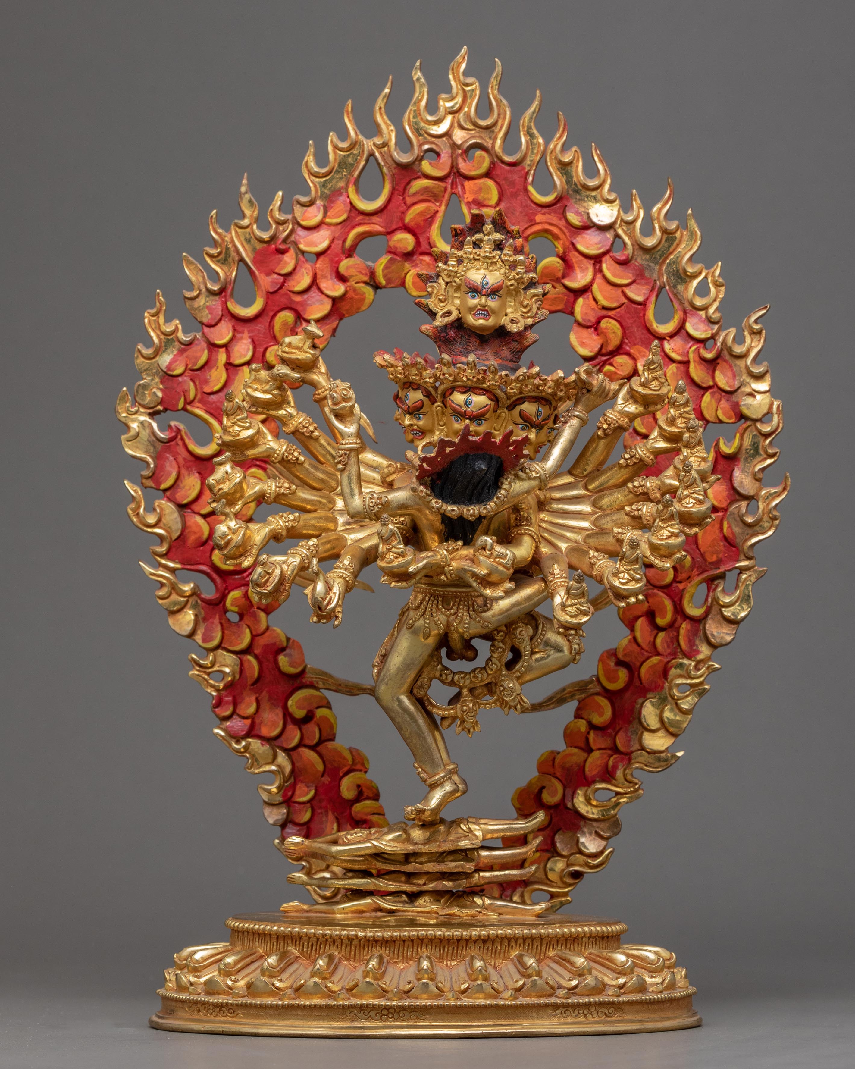 We have traditionally depicted the Yidam deity Hevajra with his consort Nairatmya in this Buddhist statue. We have portrayed them embracing each other in the dancing posture happily. You can use this sculpture in different Vajrayana practices, in your regular meditational or yoga activities, and even for indoor home decor. We have finely handcrafted in a copper body gilded with genuine 24k gold and originally hand painted with acrylic colors. We have depicted Hevajra with sixteen arms, eight faces, and four legs standing atop a sun disc lotus seat with a wrathful expression. We assure you that the materials used in this artwork are of high quality and last many years without damage or scratches.