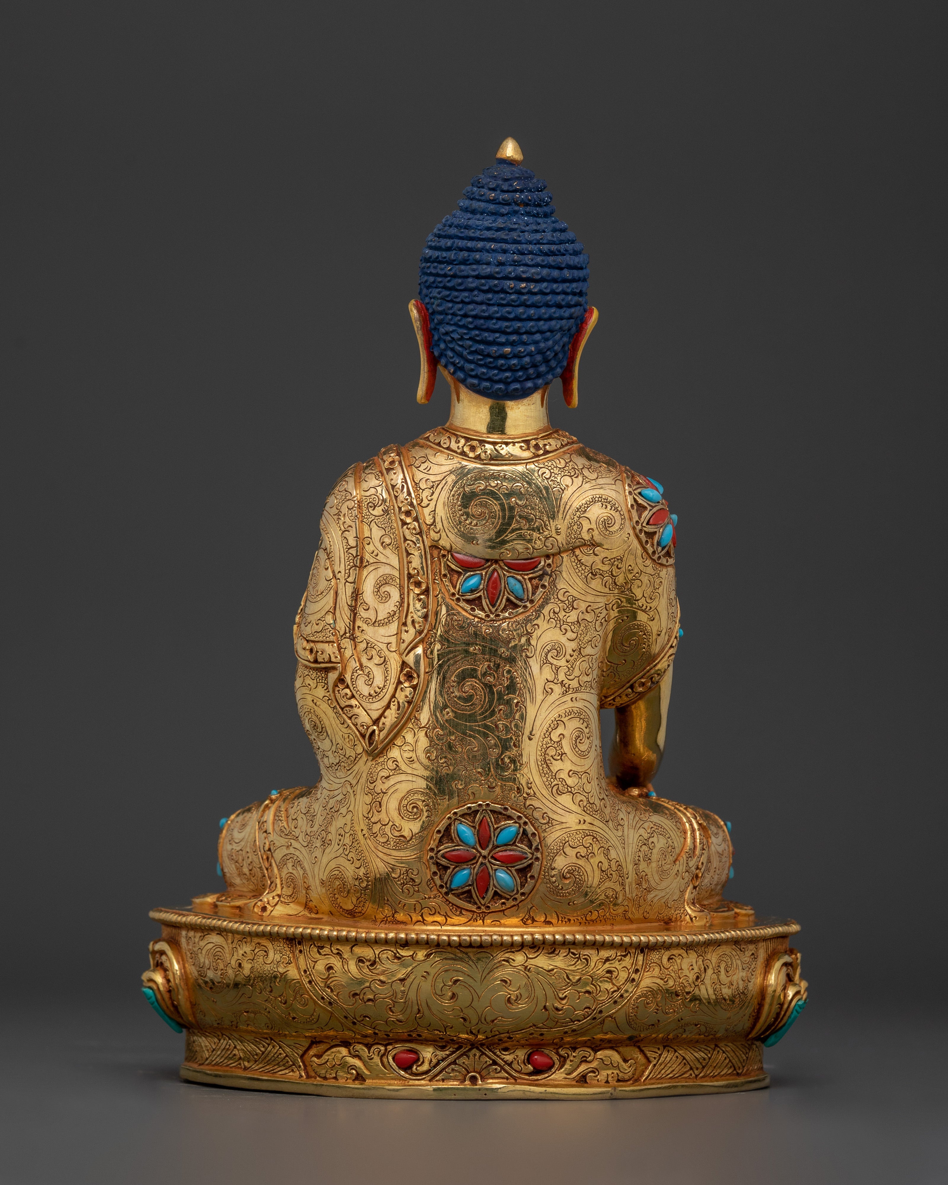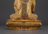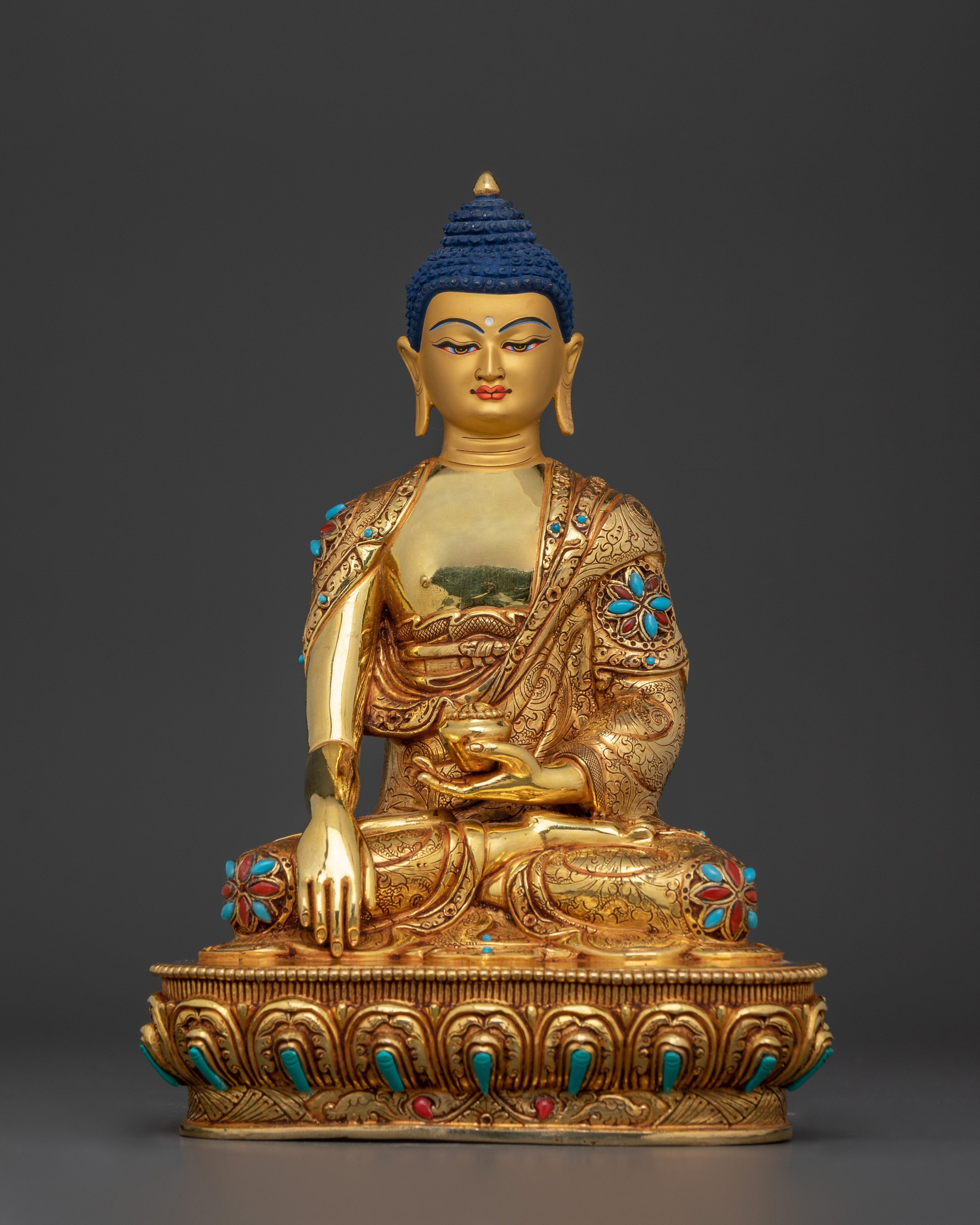 This Historical Shakyamuni Buddha Figurine brilliantly captures the Buddha's essence in his meditative condition, representing his enlightenment under the Bodhi tree. Shakyamuni Buddha, the historical figure who created Buddhism, is seen here in the dhyana mudra, a gesture of meditation and deep introspection. This handcrafted copper statue is wonderfully embellished with 24K gold gilding and gold and acrylic paintings that depict the Buddha's holy energy and grace.