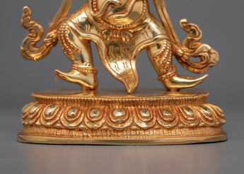 Vajrapani is shown in his wrathful form, holding a vajra (thunderbolt) to symbolize his duty as the guardian of Dharma and destroyer of ignorance. His dynamic stance and fierce expression demonstrate his unshakeable dedication to defending the Buddha's teachings and those who follow them. The glittering gold detailing, paired with the elaborate painting work, heightens the deity's regal aspect, making this statue an effective spiritual instrument for summoning protection and inner strength.