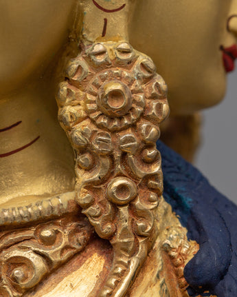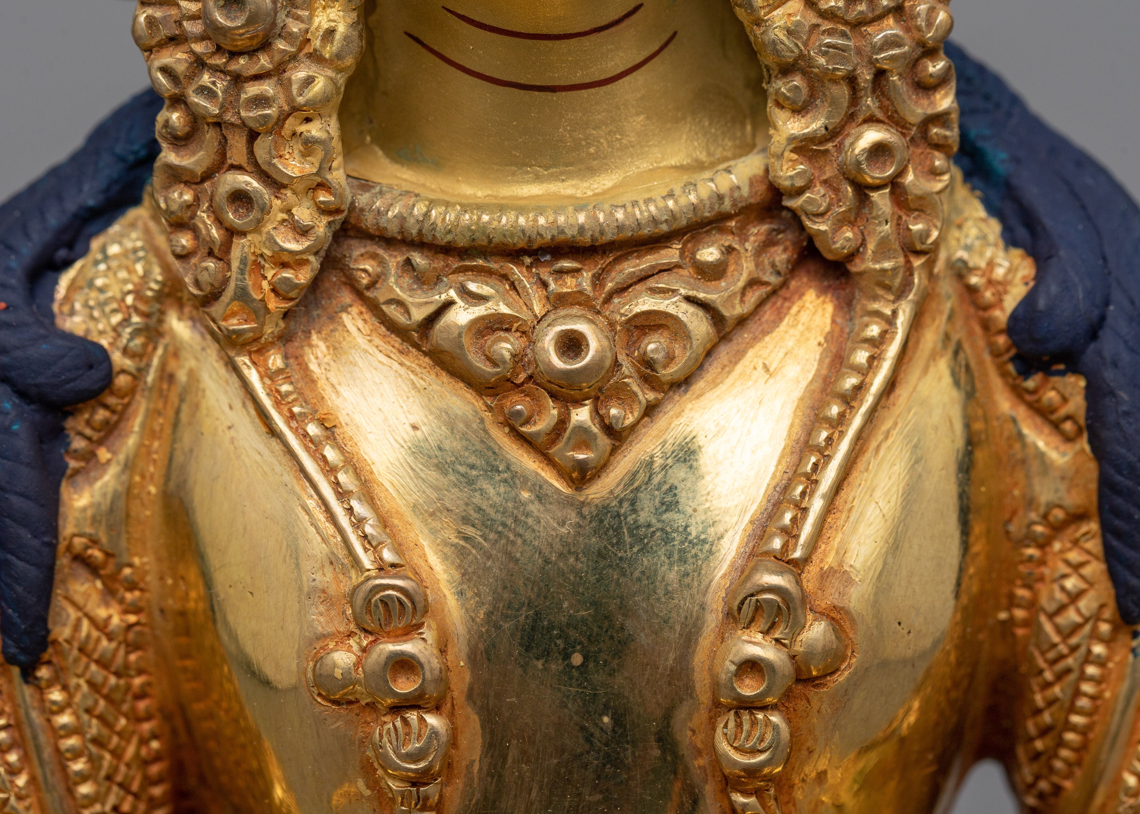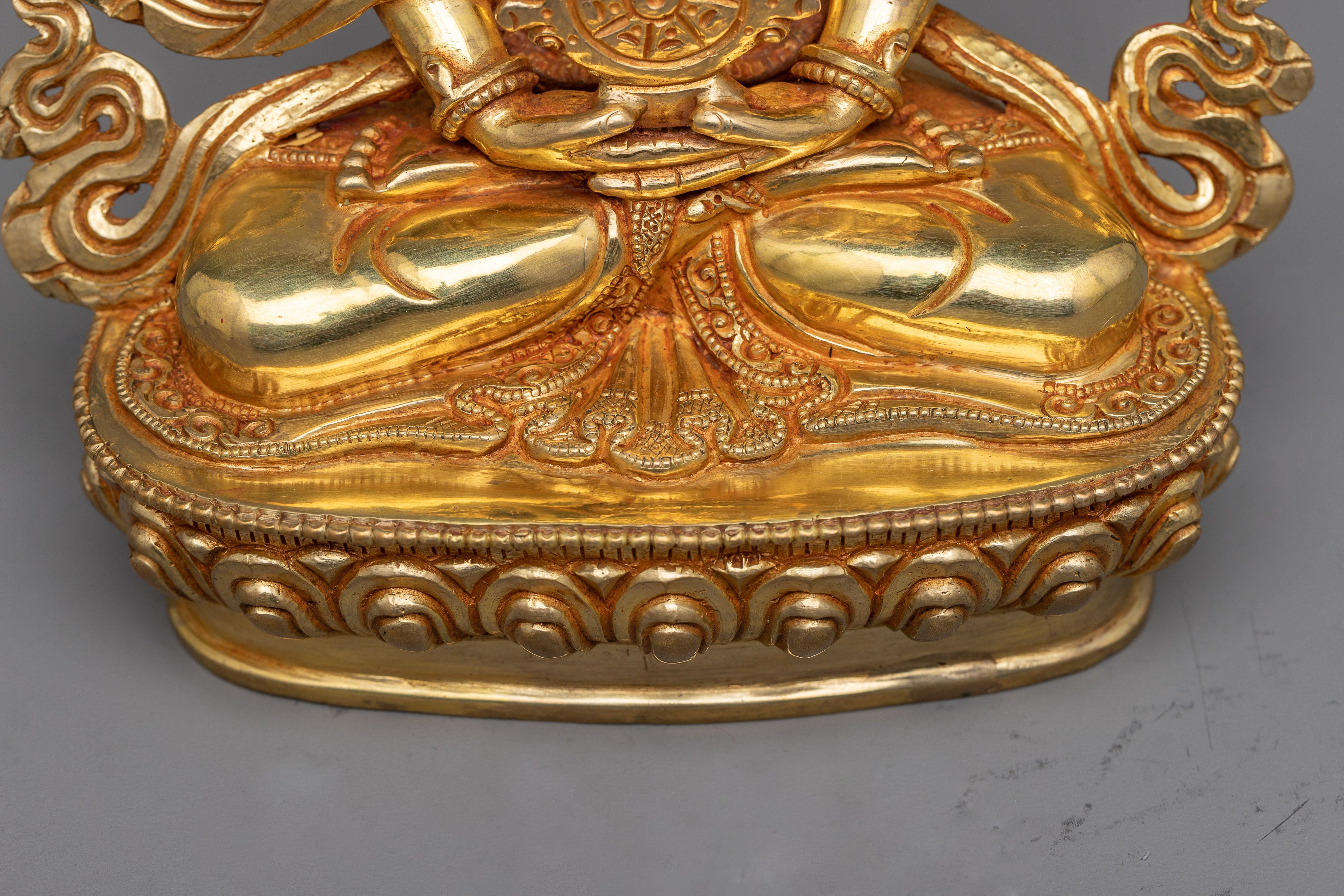 Presenting the magnificent Illuminating Vairocana Kunrig Statue. This representation of Vairocana Buddha is revered in Mahayana Buddhism as the incarnation of the Dharmakaya, the highest form of cosmic reality and ultimate truth. This statue weighs 1.59 kg and has a base diameter of 6.5 inches. Its height is 9.4 inches. It is made of a copper body with excellent 24K gold gilding and enhanced with paintings in gold and acrylic. It perfectly embodies the transcendent purity of Vairocana and the unbounded light of enlightenment that he represents.