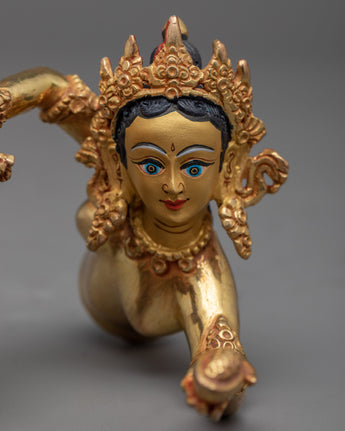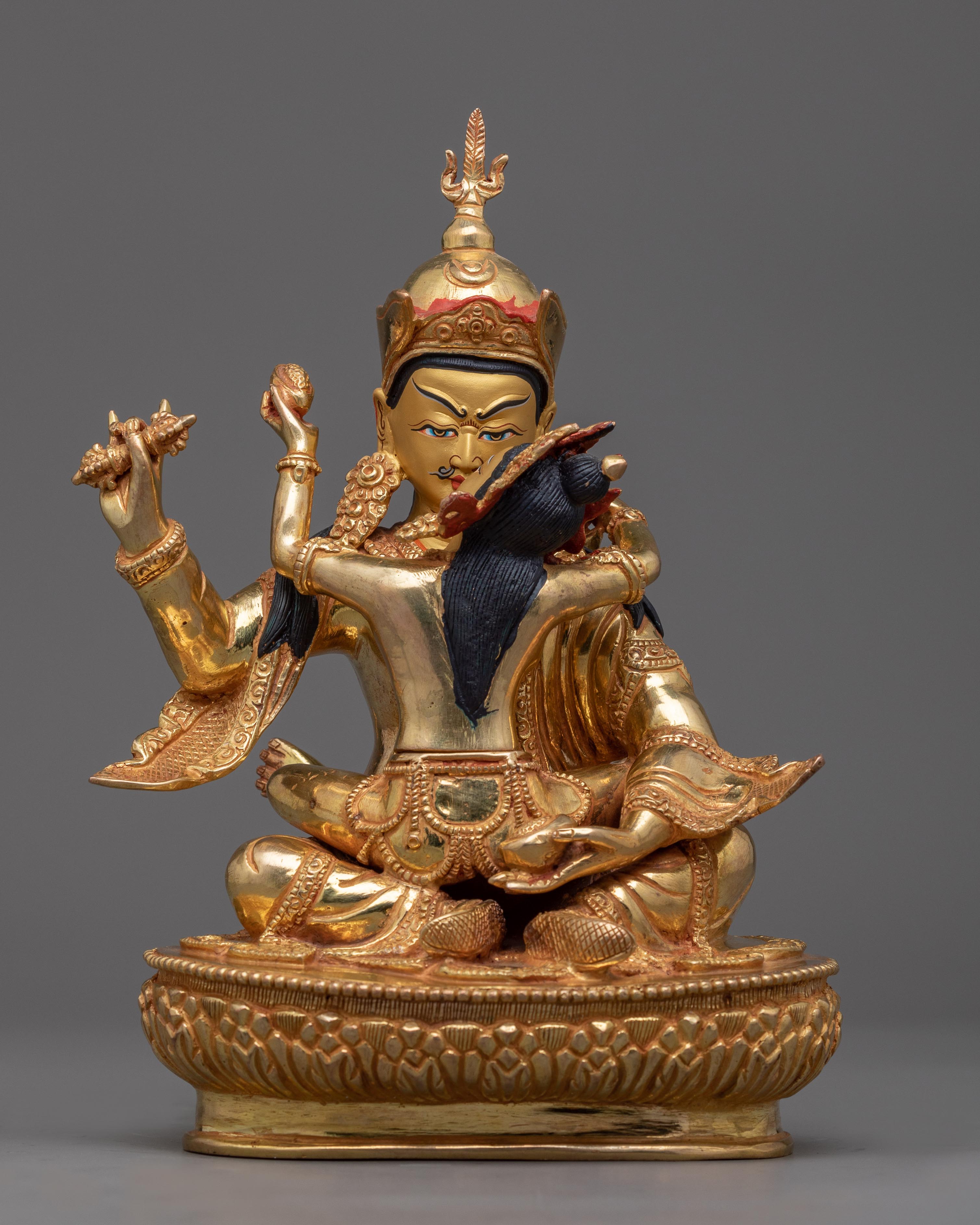 Our Guru Rinpoche and Consort Sculpture, made with outstanding precision and devotion, is an embodiment of enlightened wisdom, compassion, and harmonious oneness. This 2.24 kg item is embellished with 24k gold gilding and elaborate acrylic paintings on a strong, glossy copper body and stands 9 inches (23cm) tall and rests on a 5.9 inch (15cm) base.
