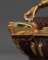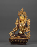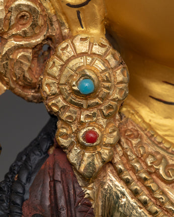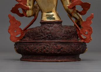 This hand-carved statue symbolizes Jetsun Dolma, the beloved Buddhist Goddess, for her compassion and protecting energies. This sculpture, measuring 12.6" (Height) x 8.7" (Base) and weighing 2.87 kg, is crafted of copper, adorned with 24K gold gilding, and enhanced with intricate gold and acrylic paints. This artwork, created by expert Nepalese artisans, has profound spiritual significance, making it an essential addition to altars, meditation rooms, or sacred decor.